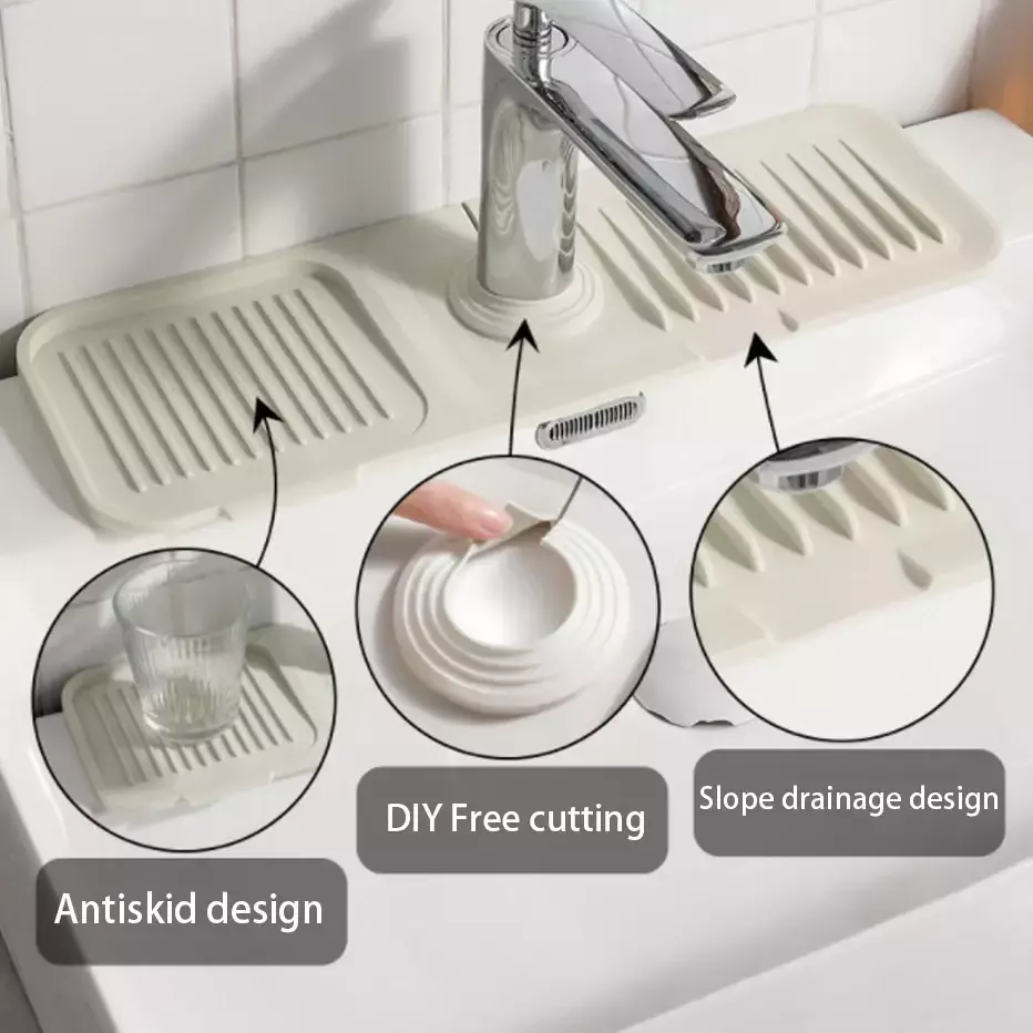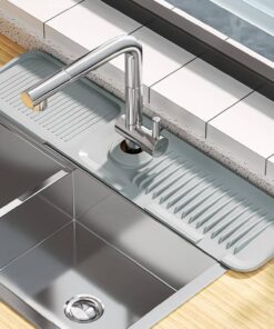 Alfombrilla de silicona, su funcion es que el drenaje inclinado dirige el agua al fregadero, las varillas de silicona elevadas aumentan el flujo de aire, mantienen tus encimeras libres de agua estancada y permiten que los artículos se sequen más rápido. El diámetro del orificio para la canilla es de 3.5cm