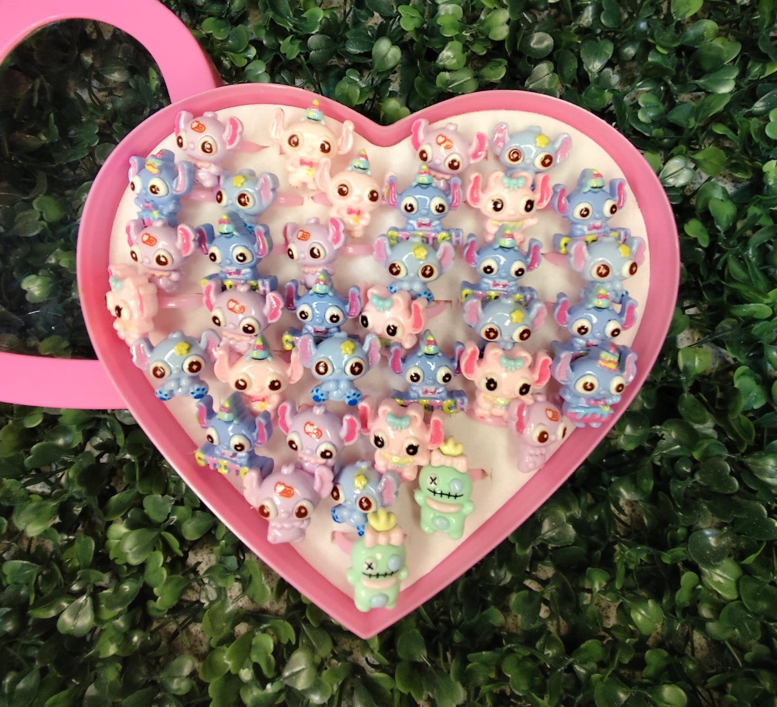 ¡Prepárate para un toque de ternura y diversión con estos anillos Stitch de corazón! ???????? Este set incluye 36 anillos adorables con los diseños icónicos de tus personajes favoritos de Stitch, como Angel, Stitch, y Scrump. Perfecto para añadir un poco de kawaii a cualquier look.