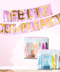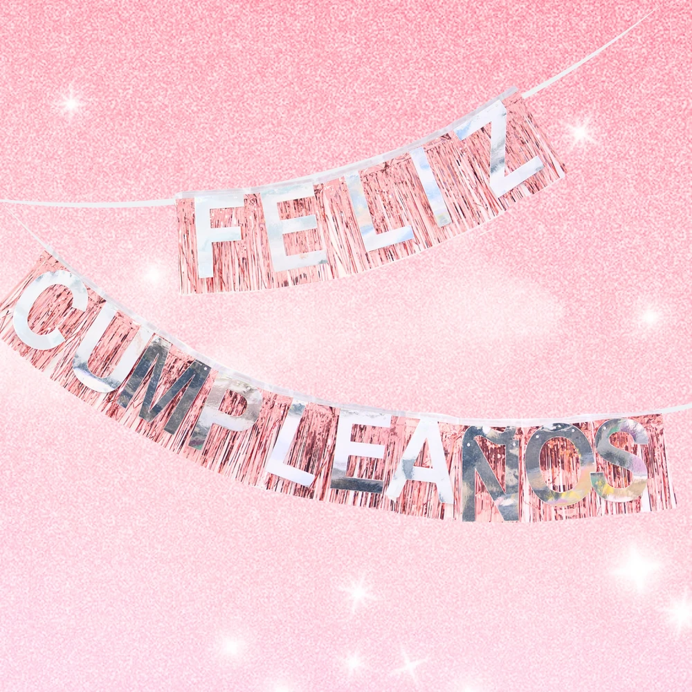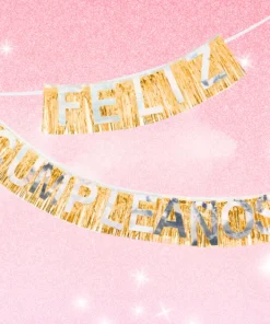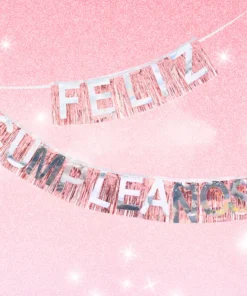 BANDERIN CON FRASE “FELIZ CUMPLEAÑOS” CON FLECOS METALIZADOS. LETRAS COLOR PLATA.