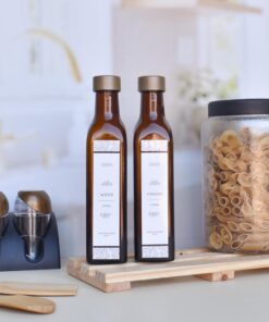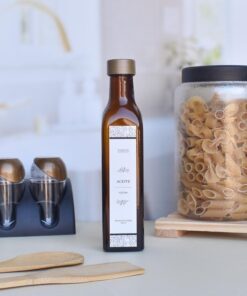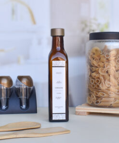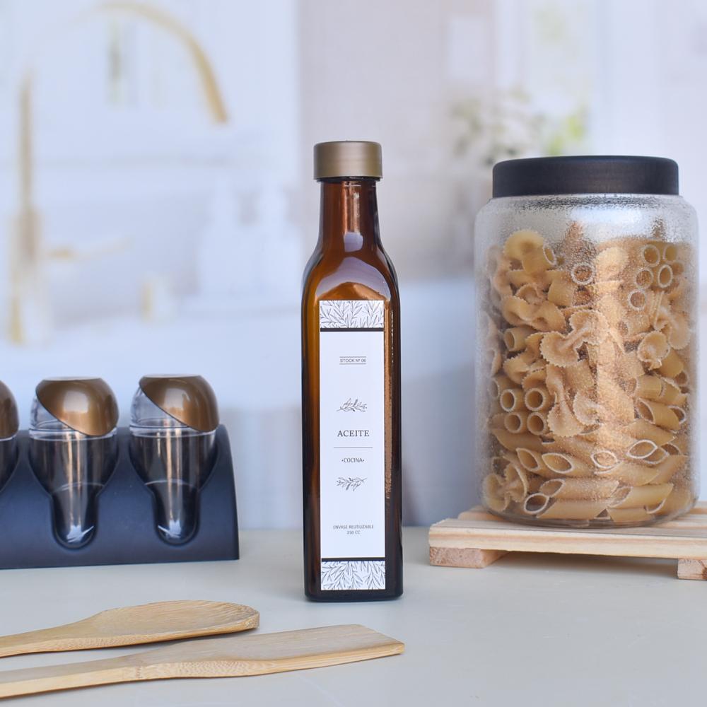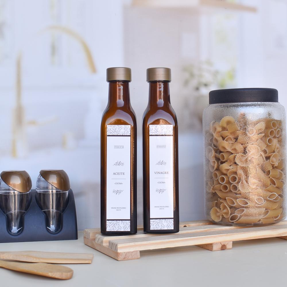 Descripción: Botella de vidrio con etiqueta para aceite y vinagre.