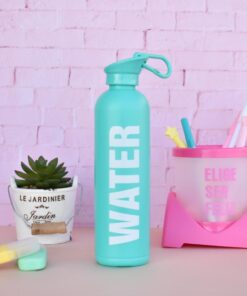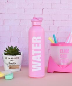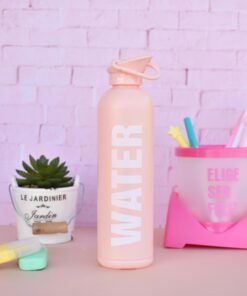 Botella recta de plástico en colores pastel con palabra WATER estampada en serigrafía blanca
