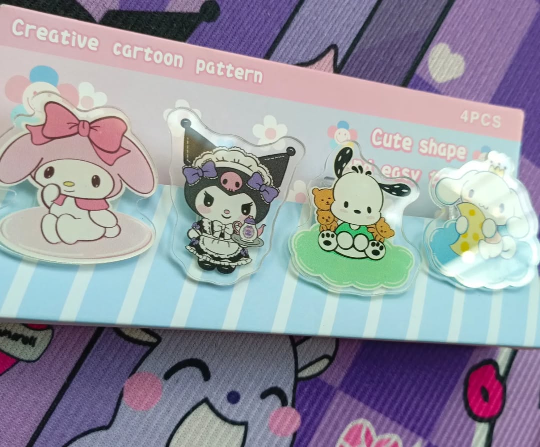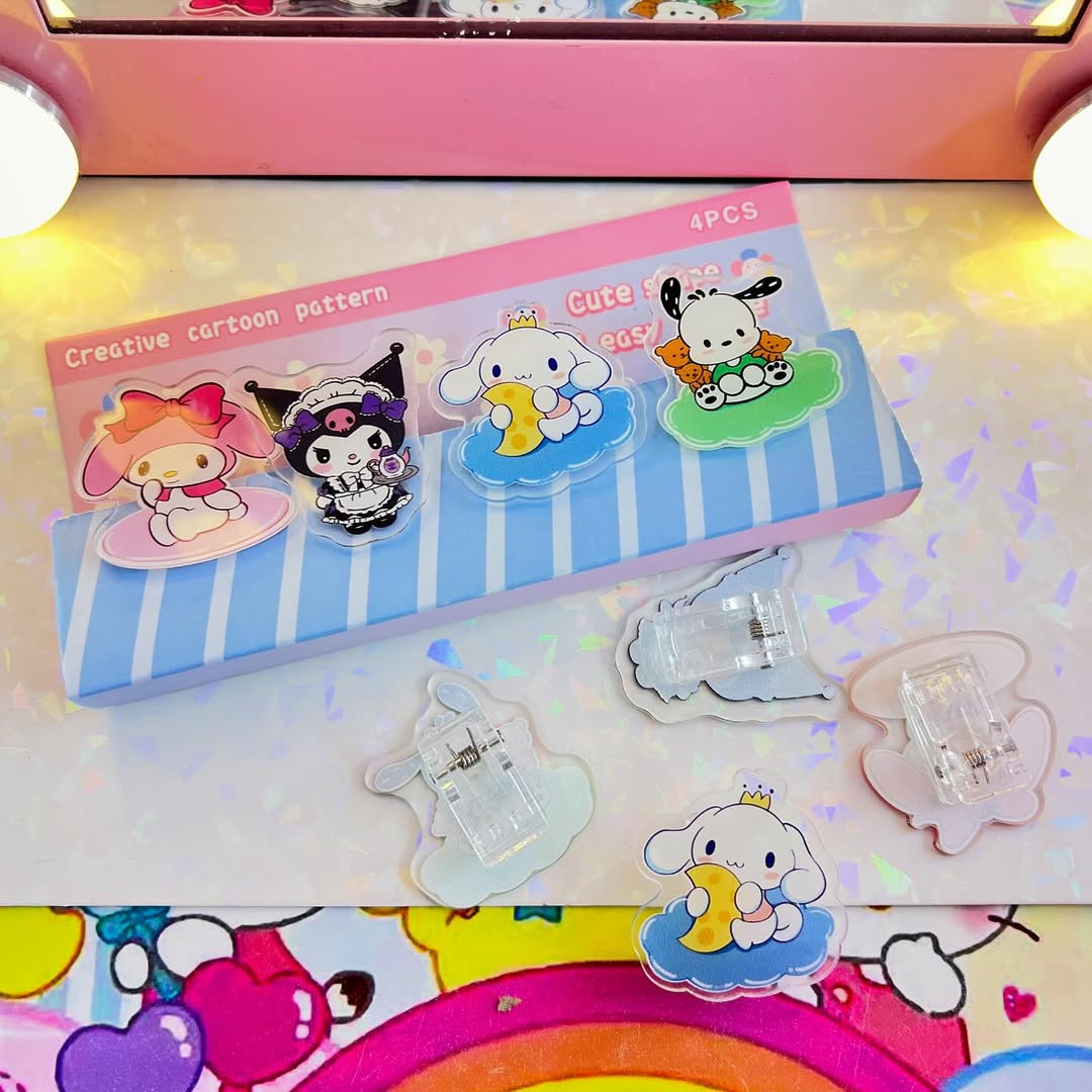 Incluye 4 broches con personajes icónicos de Sanrio (Cinnamoroll, My Melody, Kuromi, entre otros).