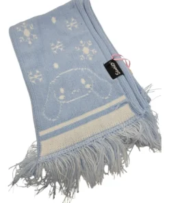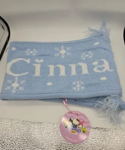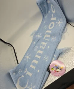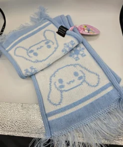 Es una bufanda tejida, suave y cómoda, con un diseño que presenta el personaje de Cinnamoroll y detalles como copos de nieve, ideal para el invierno.