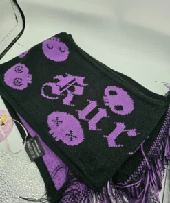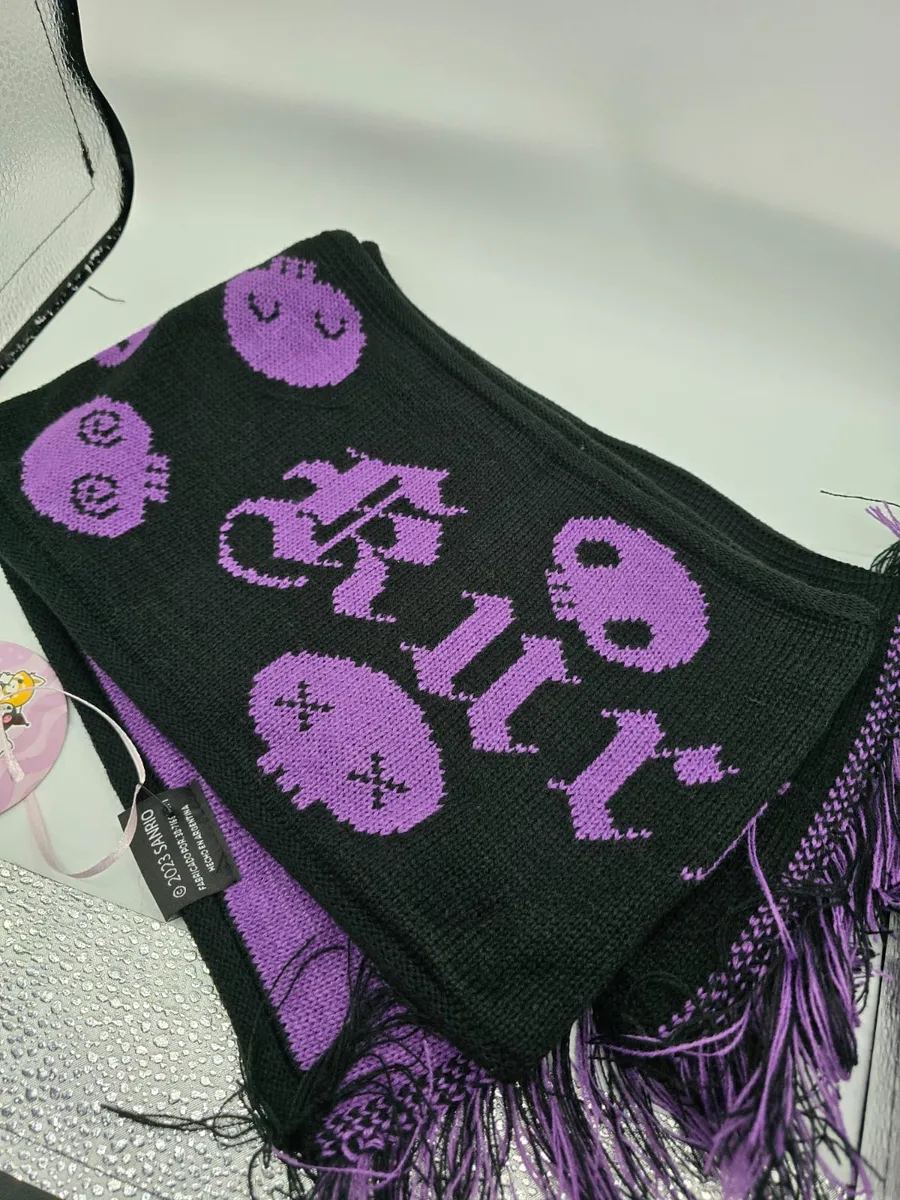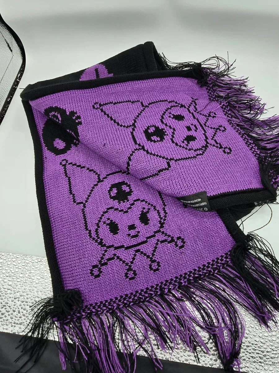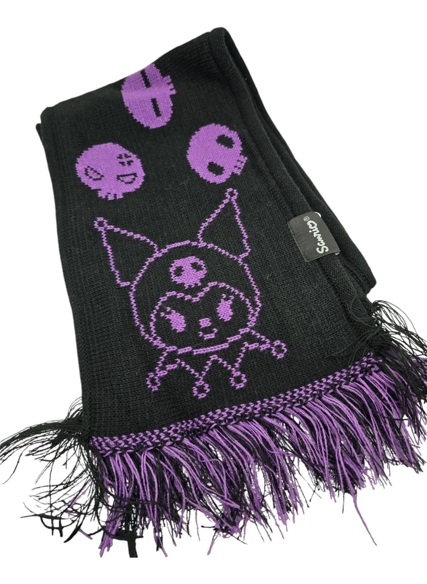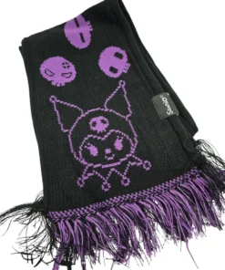 Es una bufanda tejida, suave y cómoda, con un diseño que presenta el personaje de Kuromi y detalles como copos de nieve, ideal para el invierno.