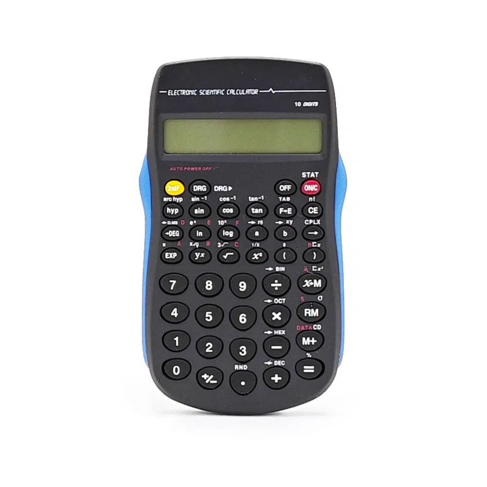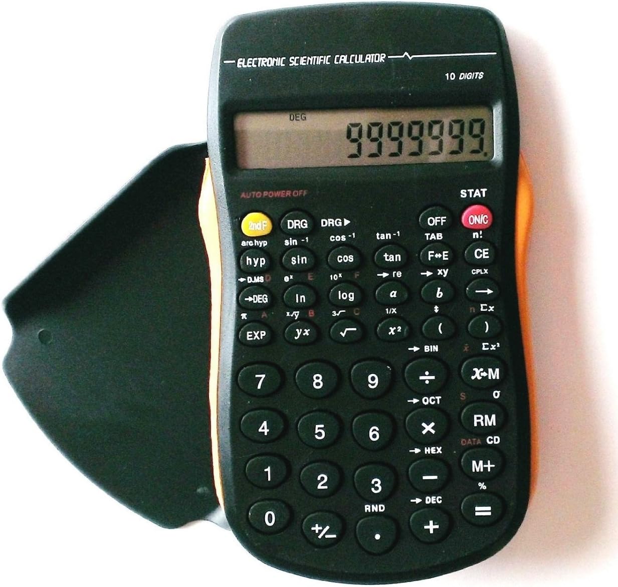 Calculadora científica tamaño de bolsillo con tapa de diseño clásico.