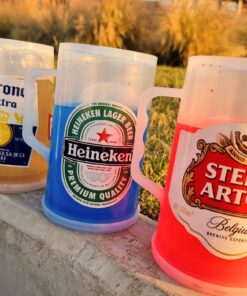 -Hermosos chopps Confeccionados con paredes de doble capa y gel que simula bebida en su interior, los mismos pueden ser colocados en la heladera y luego al ser utilizados el gel frio en su interior conservara la temperatura de la bebida servida en los mismos durante mucho mas tiempo que un vaso tradicional.