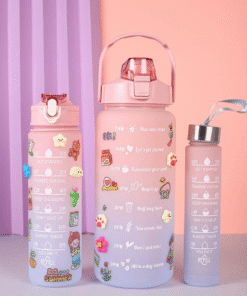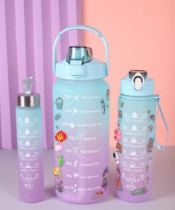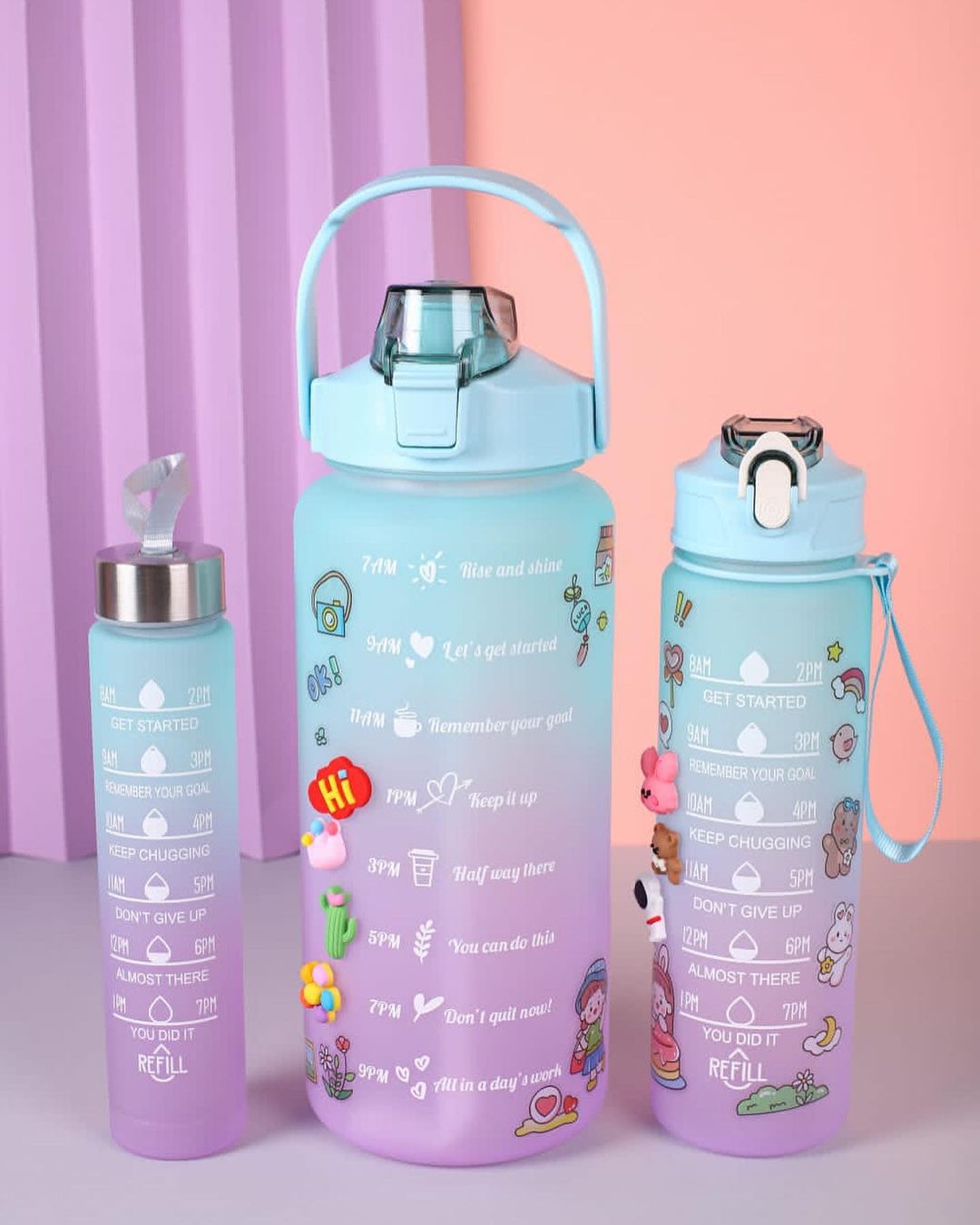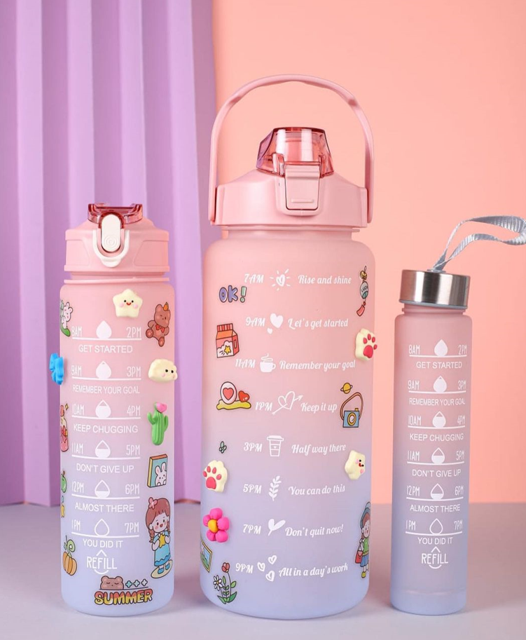 Tiene de un lado su capacidad (2 lt y 900 y 300 cc????) y del otro lado indicadores para hidratarse según la hora ✨????????
