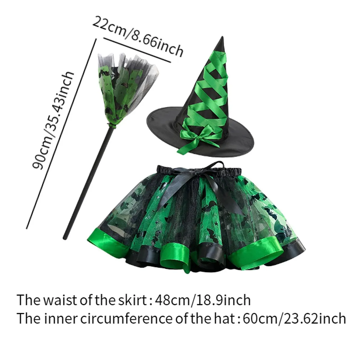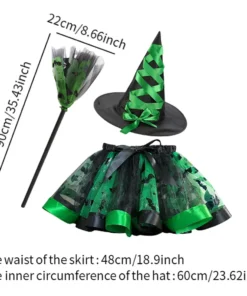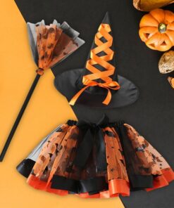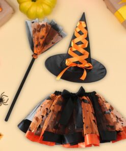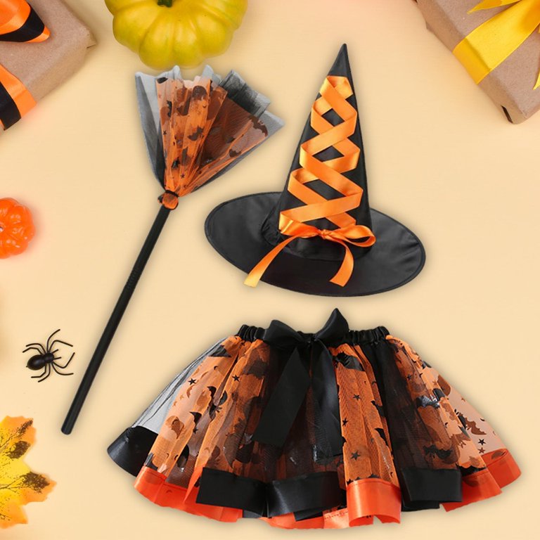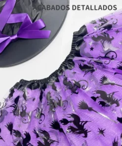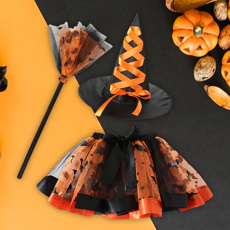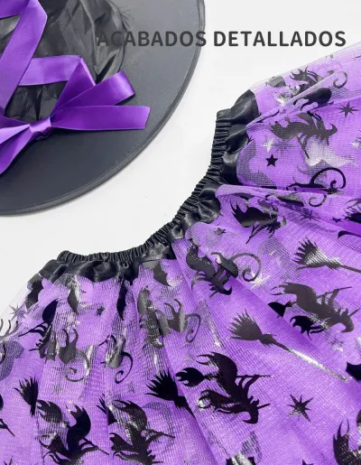 Set de disfraces para fiestas y Halloween compuesto por falda de tul estampada, sombrero de bruja a juego y escoba mágica.