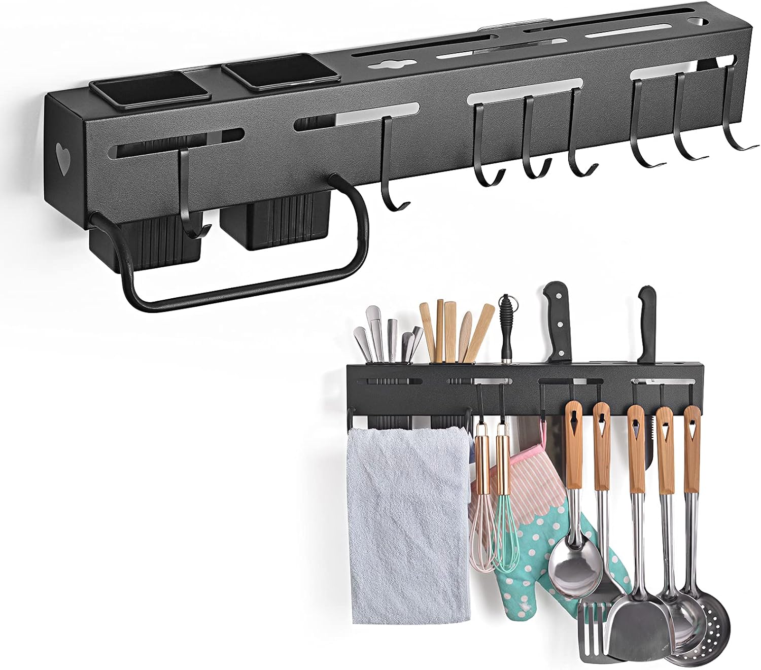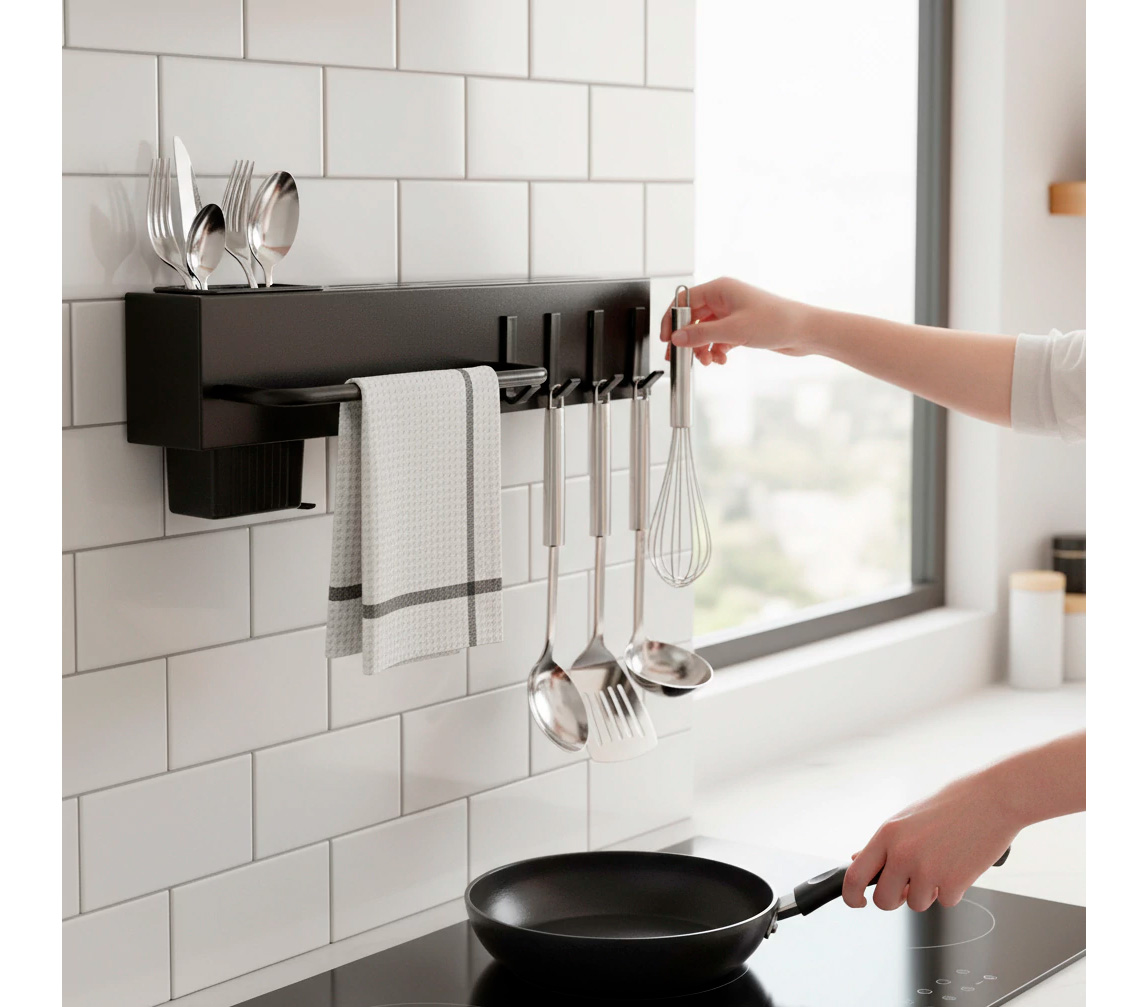 espacio de estante, compartimento para cubiertos y ganchos para colgar utensilios.