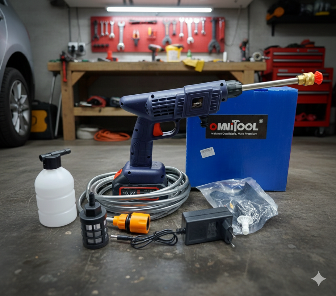 Incluye:1 Lavadora, 1 Manguera, 1 Filtro, 2 Boquillas (0° y 40°), 1 Conector de manguera, 1 Batería de litio, 1 Cargador, 1 Boquilla de espuma con contenedor, 1 Estuche de transporte.
