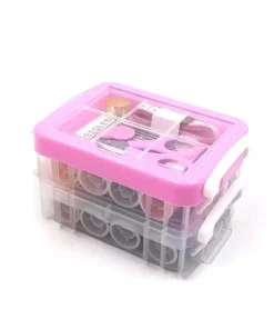 Cuenta con 16 hilos de distintos colores, un dedal, una tijera, un enhebrador, 10 agujas de distintos tamaños y una cinta métrica