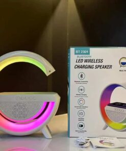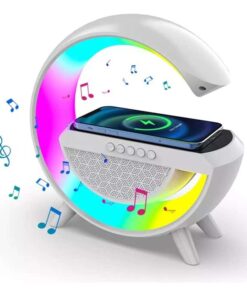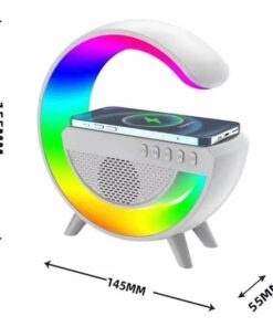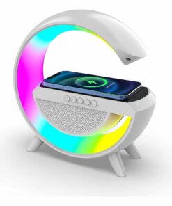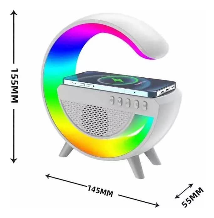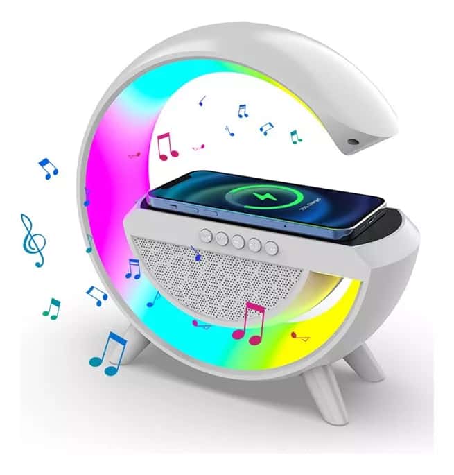 Lámpara de mesa con altavoz y cargador inalámbrico para celular.