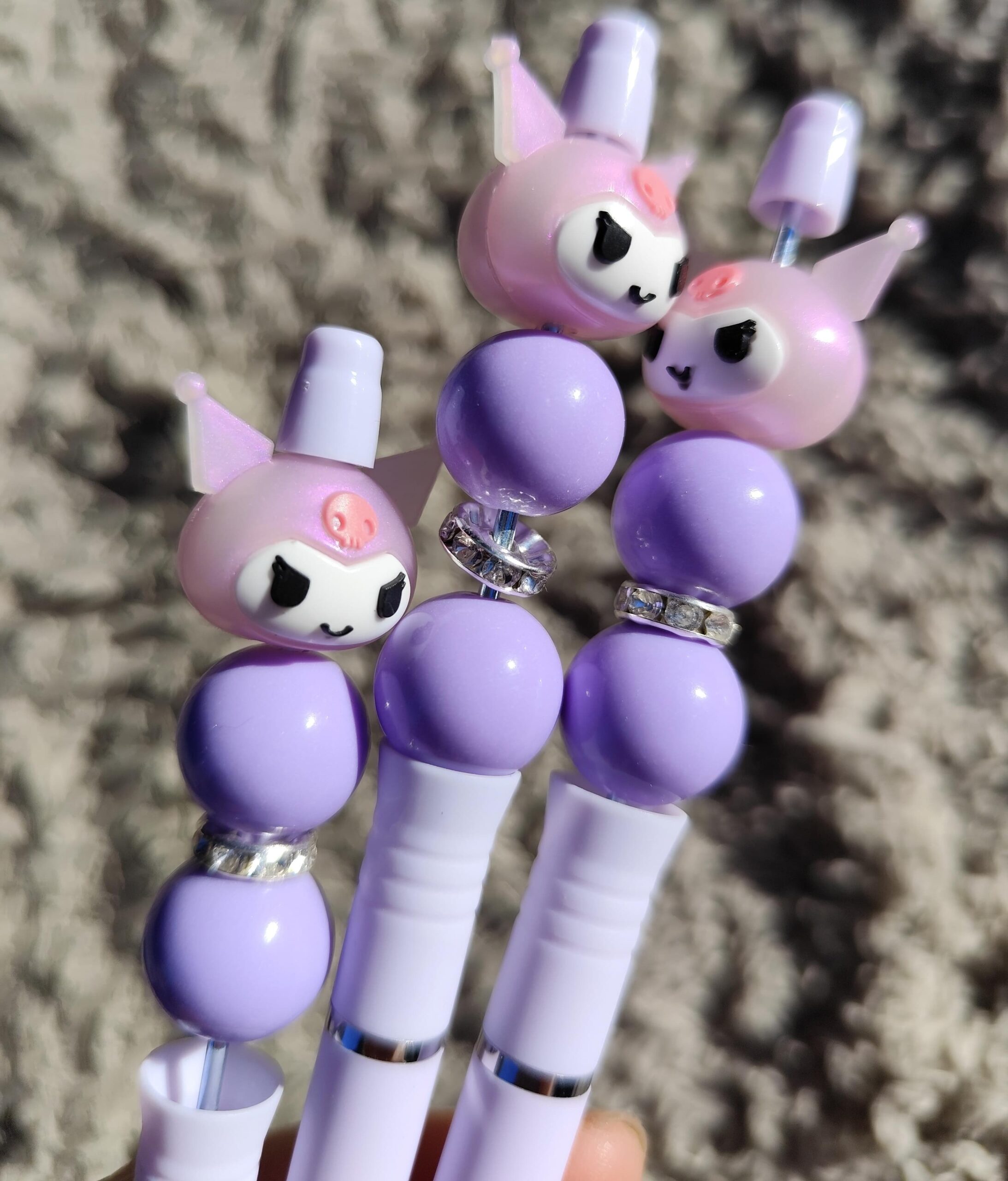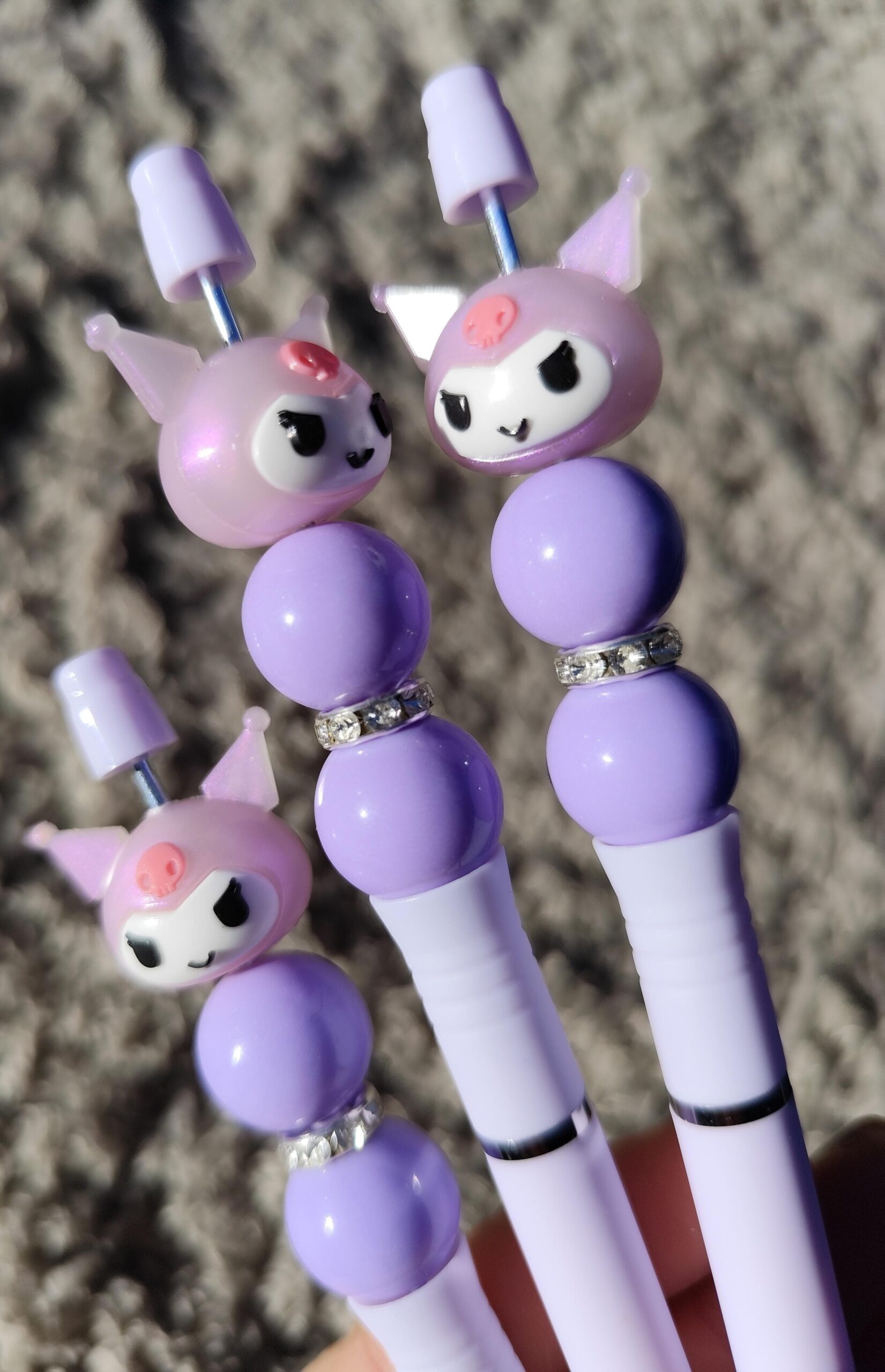 Set de 2 lapiceras con diseños inspirados en Kuromi . Cuerpo en colores pasteles con 2 bolitas y anillo de brillos decorativas. ¡Divertidas y coleccionables!