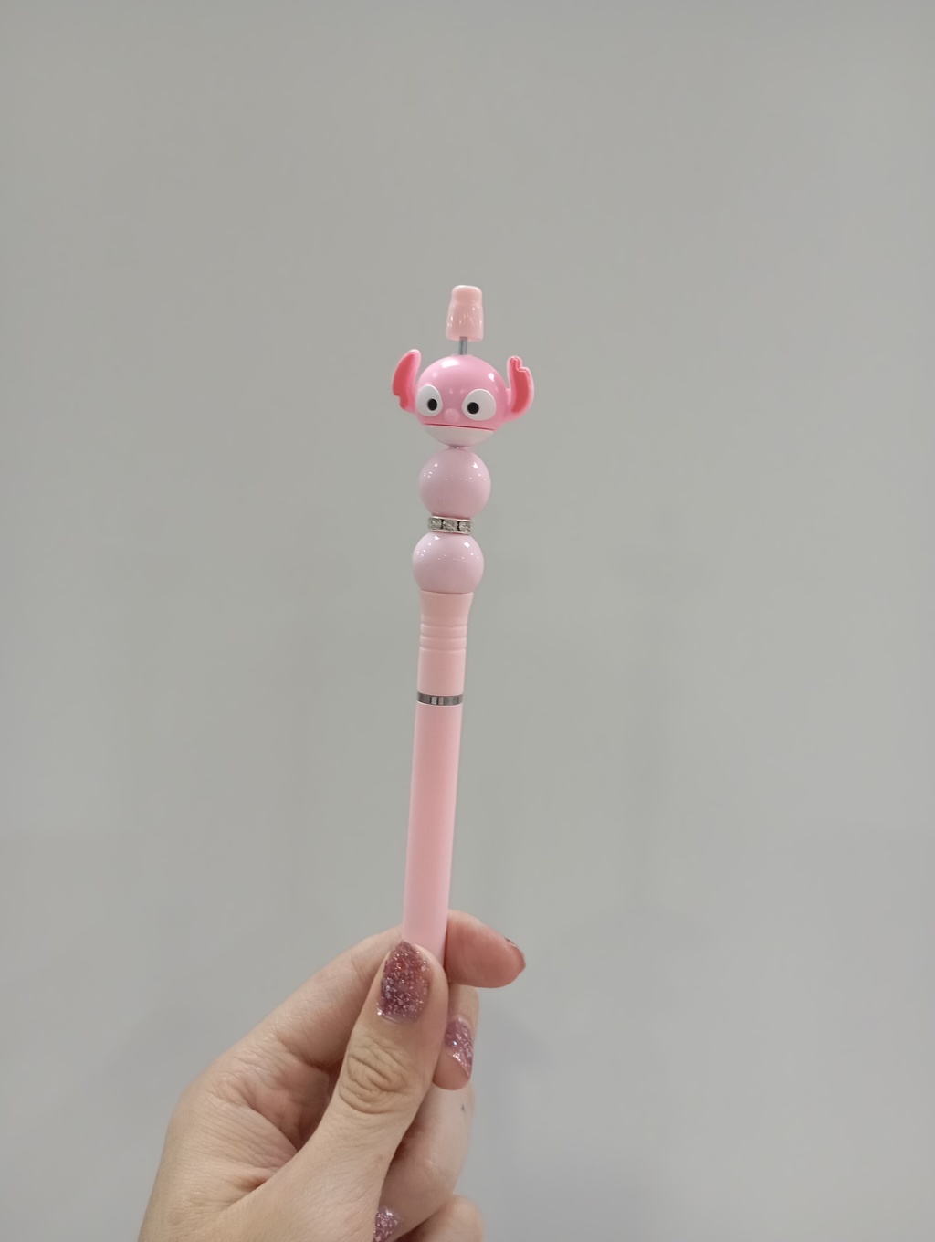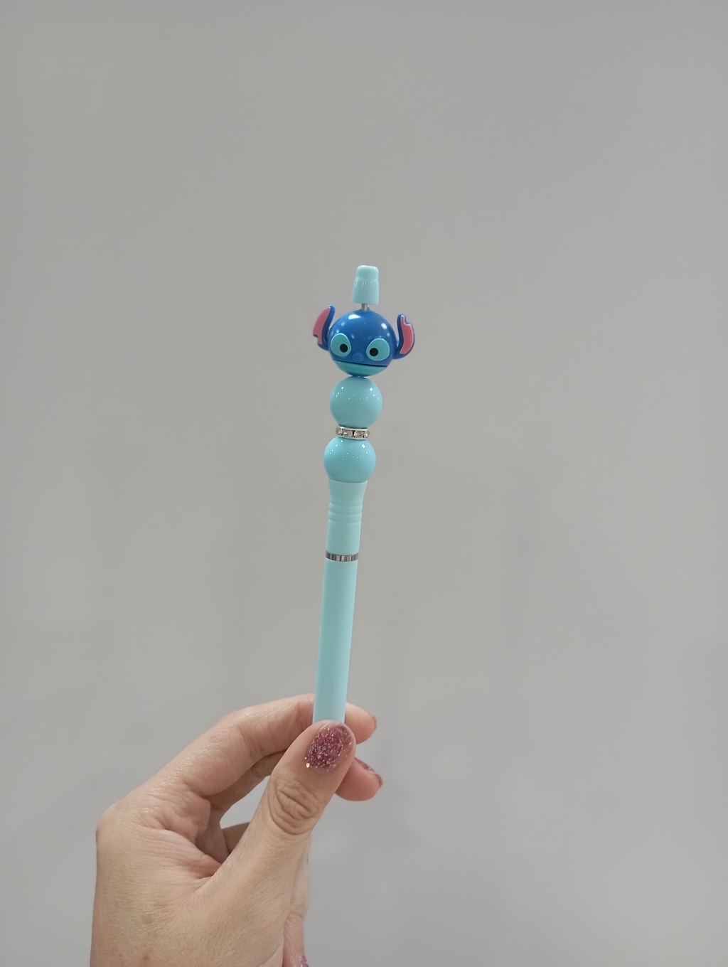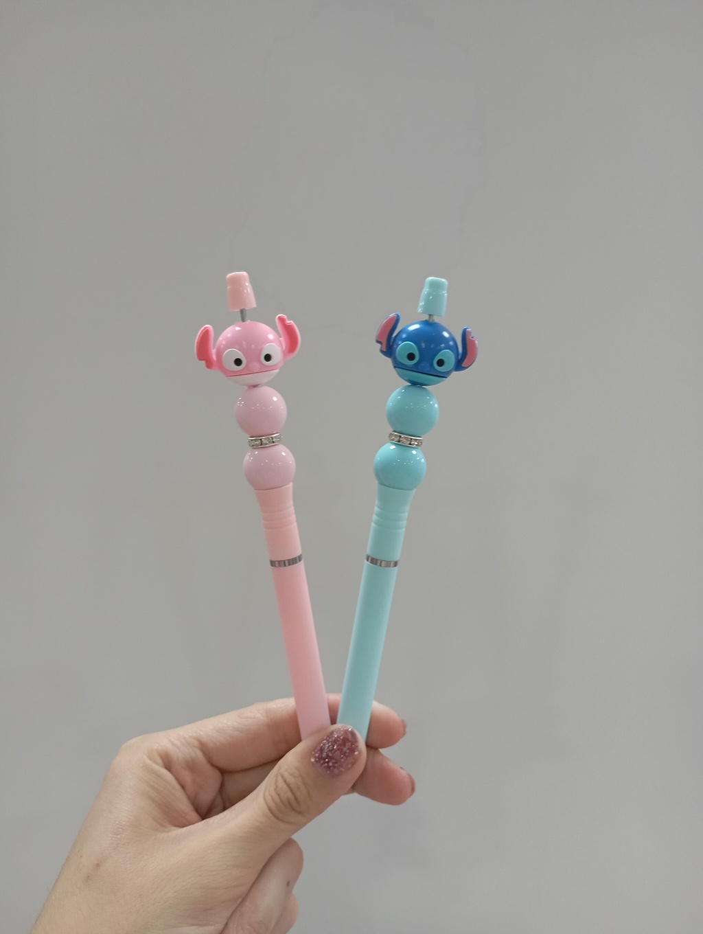 Set de 2 lapiceras con diseños inspirados en Stitch y Angel. Cuerpo en colores pasteles con 2 bolitas y un anillo de brillos decorativas. ¡Divertidas y coleccionables!
