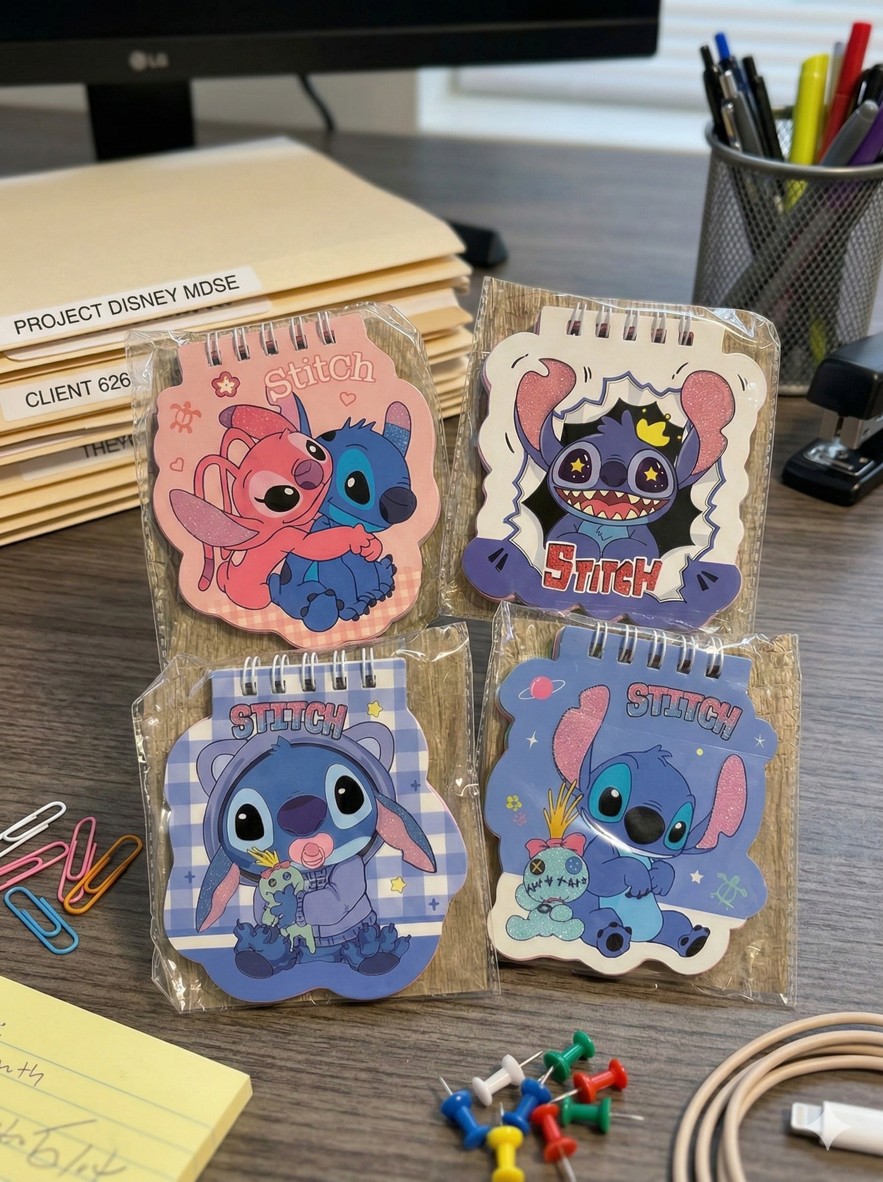 Diseño Único: Tapa troquelada con ilustraciones vibrantes de Stitch y sus amigos (varios modelos disponibles).