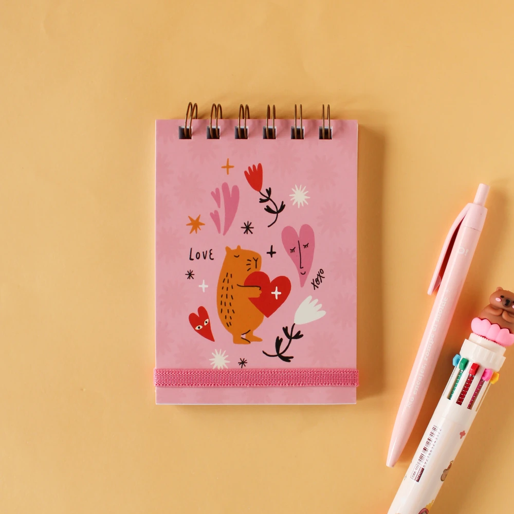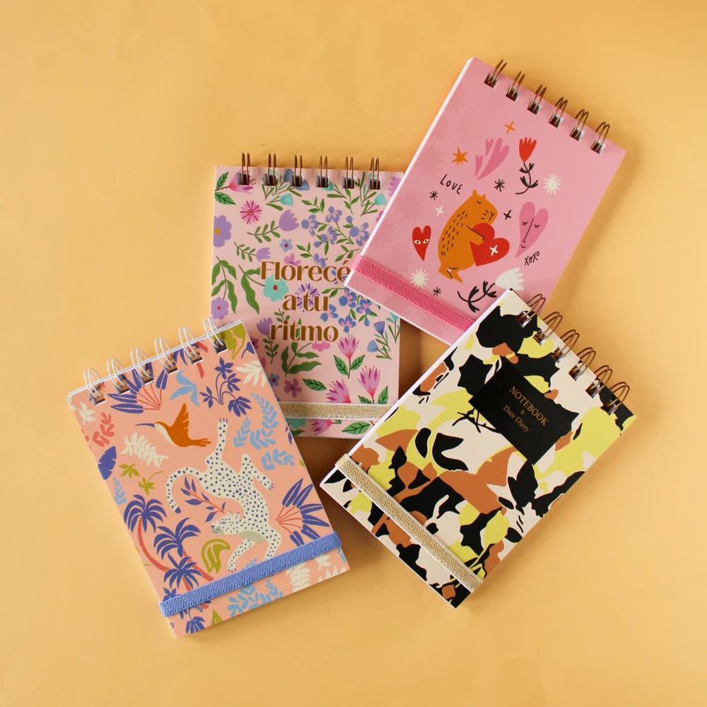 Libretas anilladas con elástico con los diseños más creativos. Ideales para llevarlas siempre con vos. Terminación de las tapas con Laca.