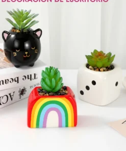 Maceta decorativa con diseño de arcoíris y suculenta artificial incluida. Un detalle adorable y moderno para decorar tu escritorio, oficina o cualquier rincón del hogar.