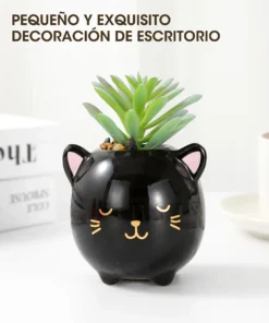 Maceta decorativa con diseño de gatito negro y suculenta artificial incluida. Un detalle adorable y moderno para decorar tu escritorio, oficina o cualquier rincón del hogar.