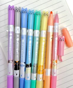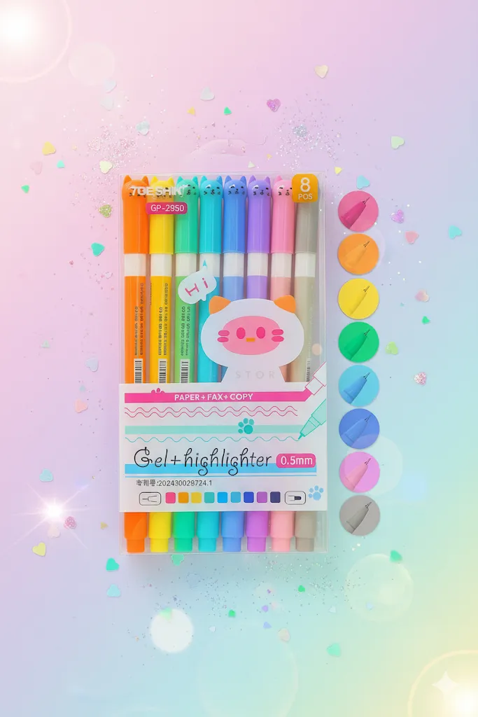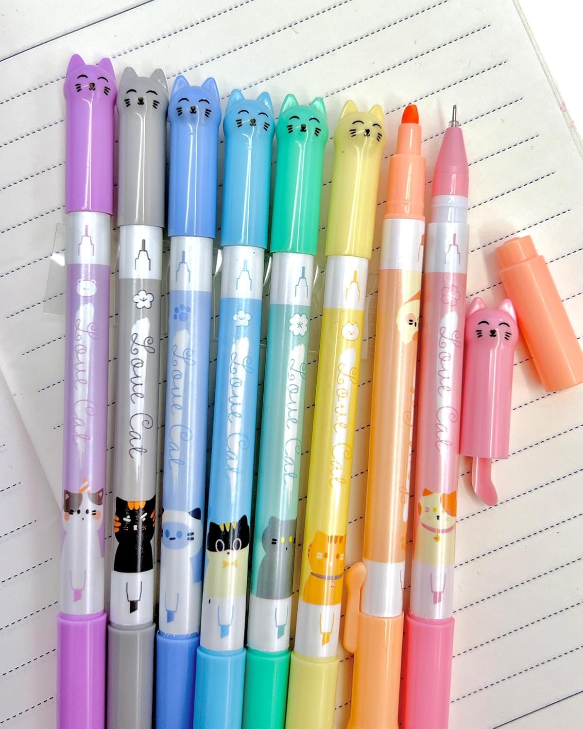 Este exclusivo kit incluye 8 bolígrafos increíbles que combinan funcionalidad y ternura. Cada bolígrafo tiene dos extremos: un bolígrafo de punta fina de 0,5 mm, perfecto para una escritura precisa; y un resaltador vibrante para resaltar tus notas. Con capuchones con forma de gato, este set es ideal para estudiar, crear o para quienes aman la papelería original.