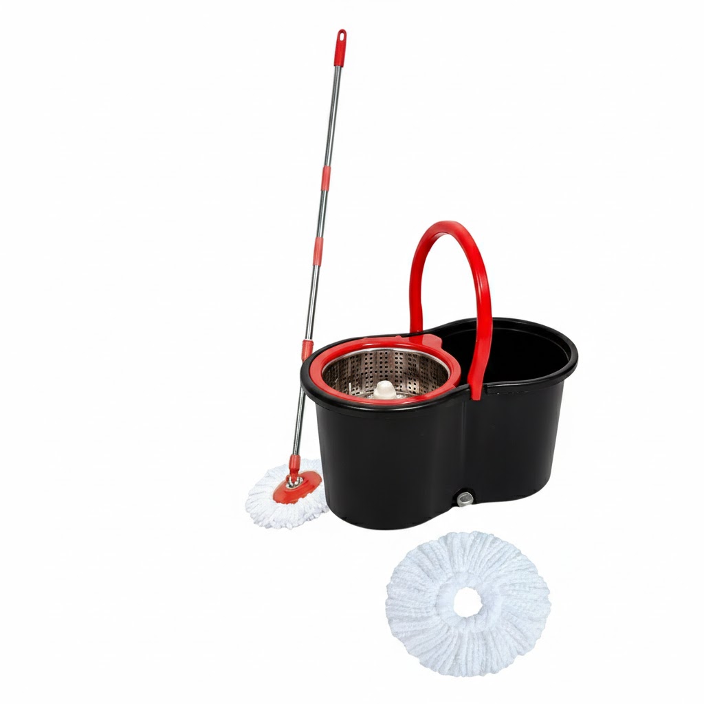 Te presentamos este excelente balde mopa con centrifugado y enjuague 360°. Centrifugado de acero inoxidable y mango del mismo material. En la base posee ruedas, incluye mopa supe absorbente y una de repuesto. La limpieza nunca fue tan fácil, permite limpiar múltiples superficies de forma rápida y sencilla, sin necesidad de escurrir trapos.