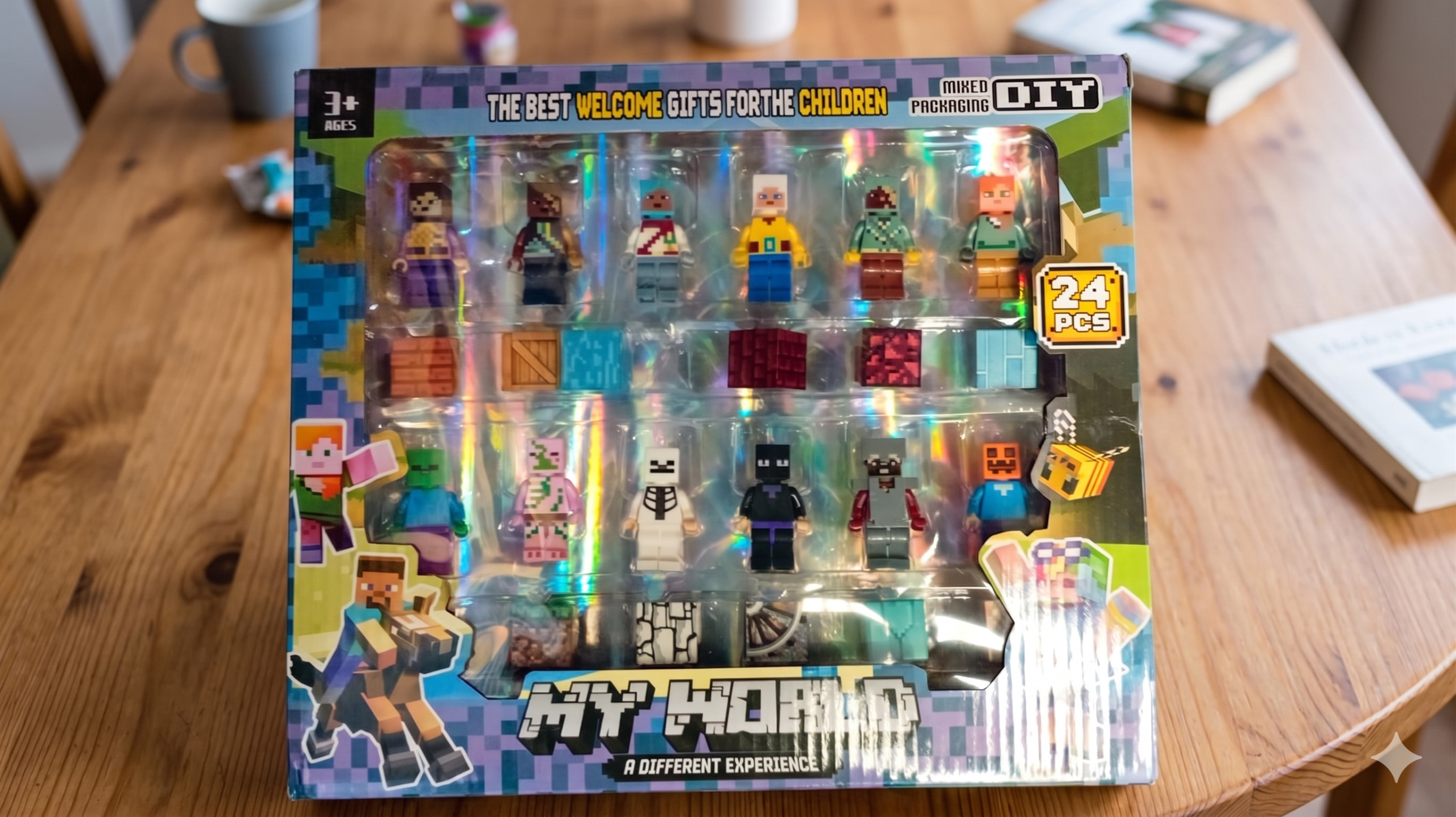 Este conjunto incluye 24 bloques de construcción, cada uno de 3 cm, que te permitirán crear tus propias aventuras en el universo pixelado que tanto amas.