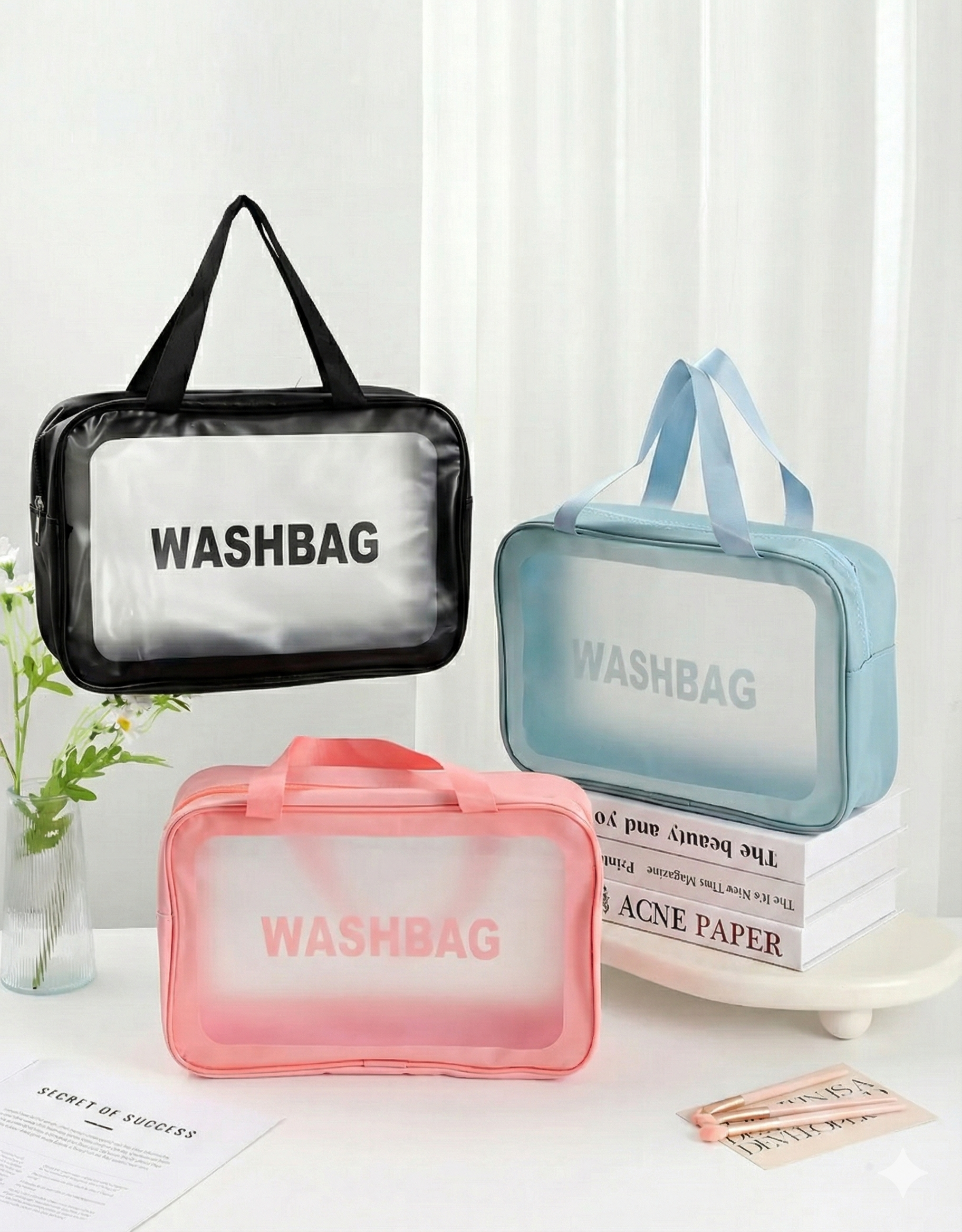 Práctico y moderno neceser tipo washbag, ideal para llevar tus productos de higiene, maquillaje o cosmética de forma organizada. Diseñado con material resistente e impermeable, cuenta con un frente transparente que permite visualizar fácilmente el contenido. Su cierre seguro y manijas reforzadas lo hacen perfecto para viajes, gimnasio o uso diario.