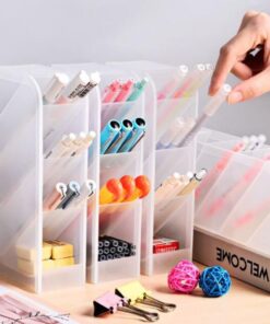 Mira lo que es este organizador, es super practico para organizar tu escritorio, brochas, pinceles y mucho mas!! Se puede usar en dos posiciones, vertical u horizontal, úsalo como te quede mas cómodo! Trae 4 compartimientos, es de plástico y vienen en transparente.
