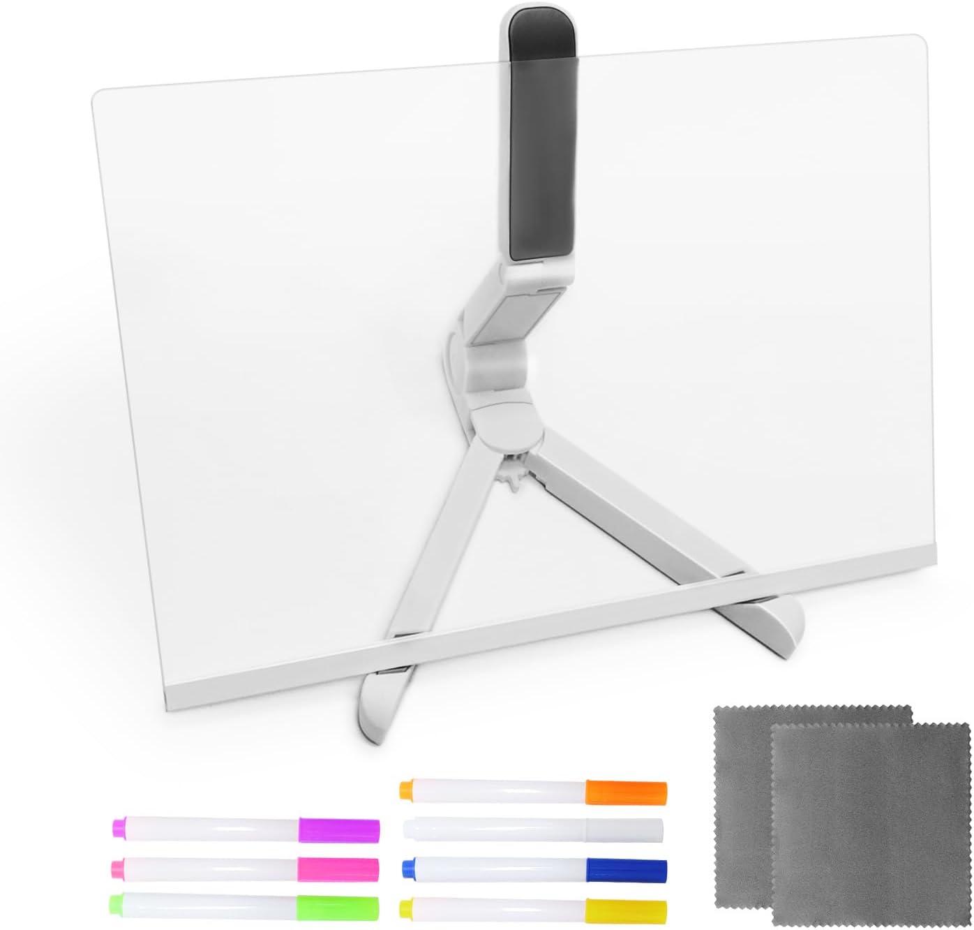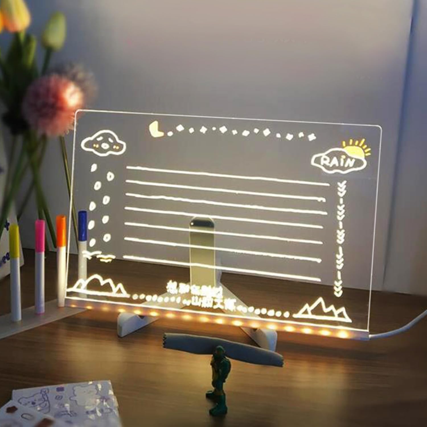 (El producto contiene un cable USB, 7 fibrones de colores, un soporte y una pizarra LED. Puedes utilizarlo como tablero de planificación, notas, calendario o como mas te guste. El soporte es ajustable y es fácil de limpiar).