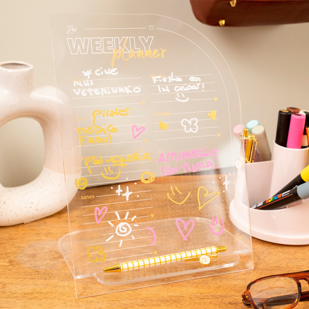 Pizarra acrilica con pie de 29.7 x 21 cm con detalles en stamping, ideal para el escritorio. Incluye marcador para anotar recordatorios o mensajes.
