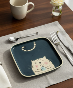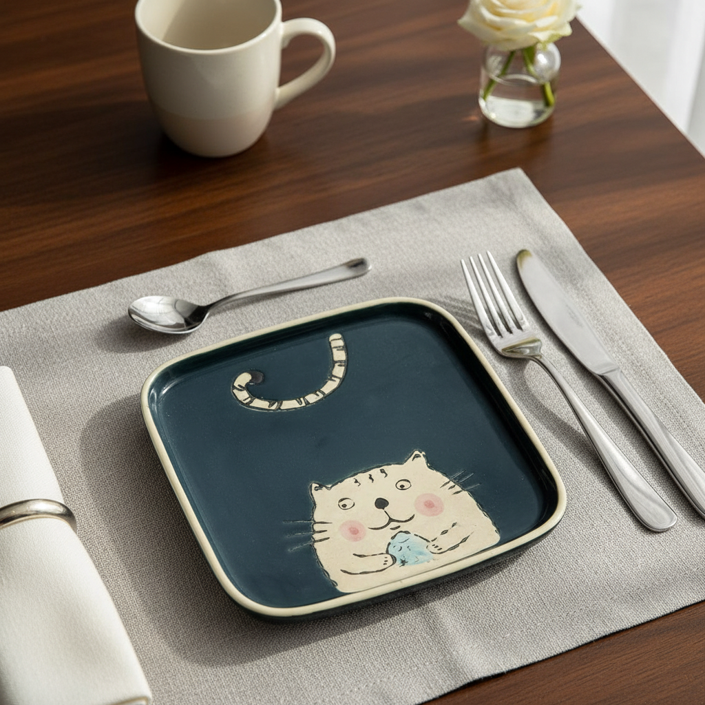 Plato Cuadrado De Cerámica Animado Gatito Blanco