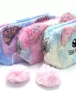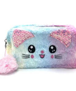 Portacosmetico de felpa con cara de gato colorido.