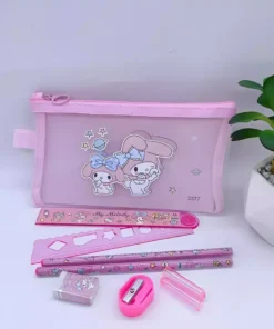Cada cartuchera con temática de Sanrio cuenta con dos lápices, 2 tapitas para el lápiz, 1 reglas de 30cm plegable, un sacapuntas y un borrador. Ideal para regalar