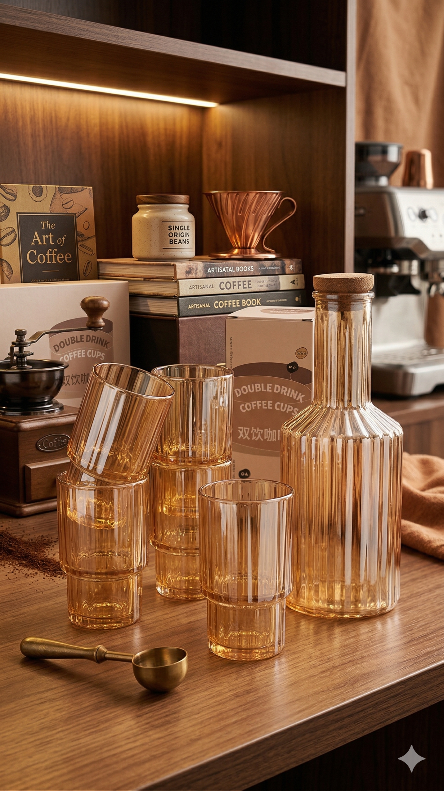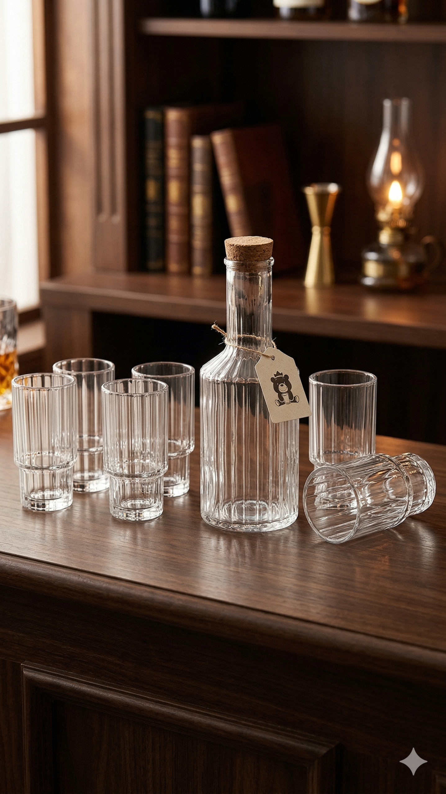 incluye la botella con cuerpo trabajado y tapón de corcho natural + 6 vasos de vidrio transparente con el mismo diseño.