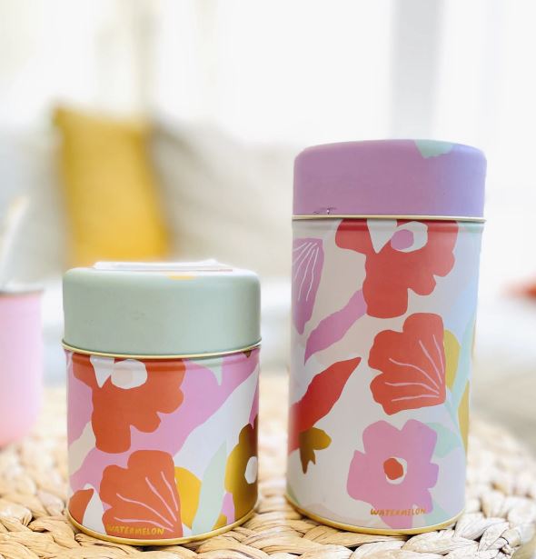Set de latas de hojalata con pico vertedor plástico. Son ideales para contener yerba o azúcar.