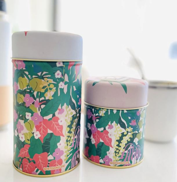 Set de latas de hojalata con pico vertedor plástico. Son ideales para contener yerba o azúcar.