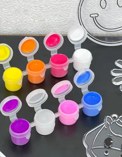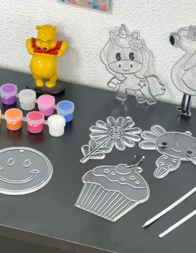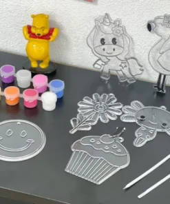 6 figuras plásticas listas para pintar (flor, unicornio, carita feliz, flamenco, cupcake, entre otros).