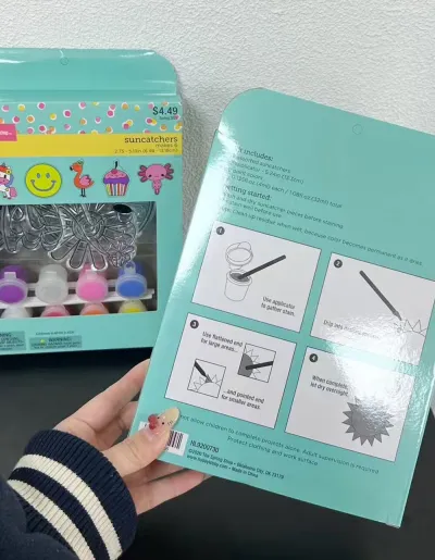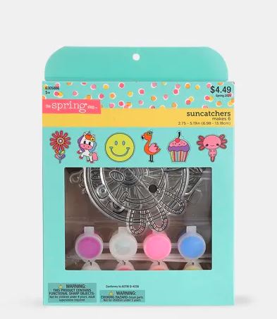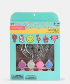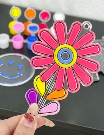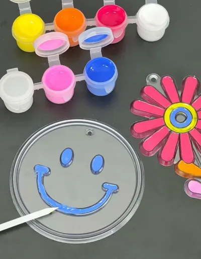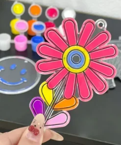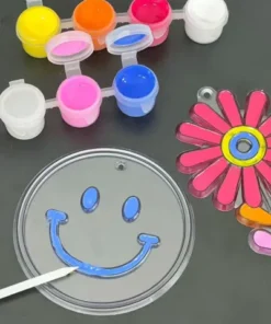 Set de manualidades con figuras para pintar y colgar. Incluye 6 diseños diferentes en láminas plásticas transparentes con bordes delimitados, ideales para colorear y crear colgantes decorativos que capturan la luz.