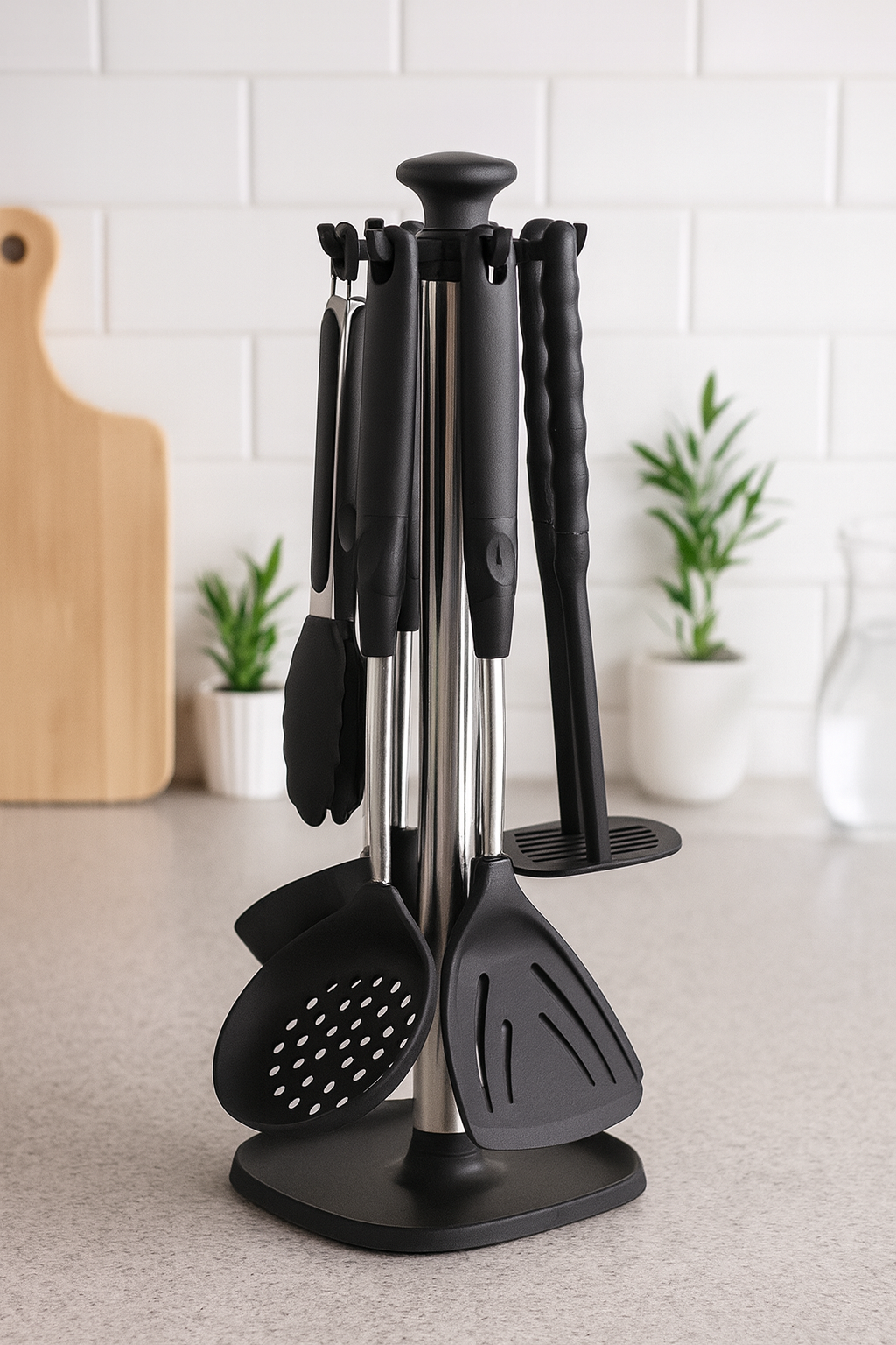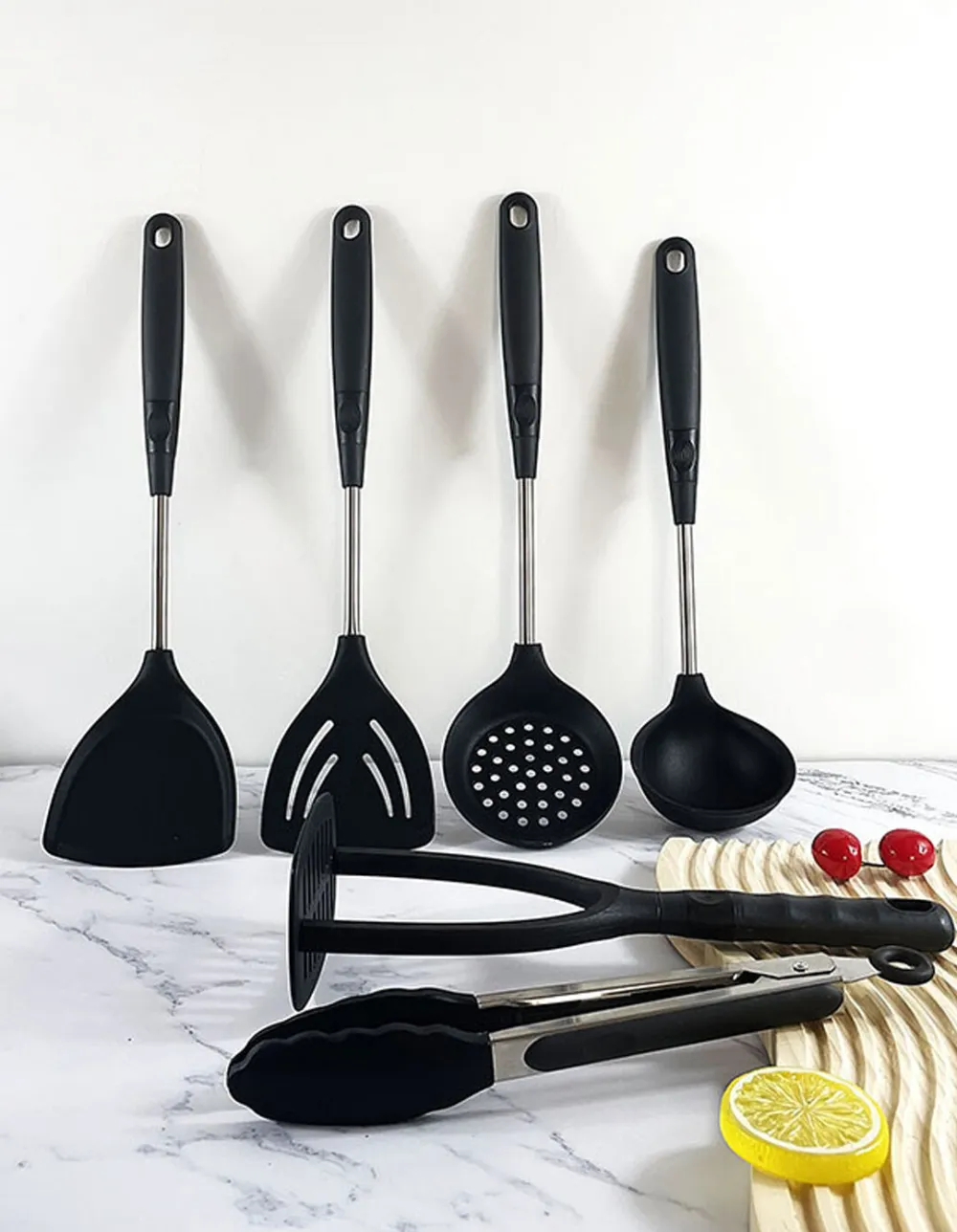 1 porta utensilios, 1 cuchara escurridor, 1 espatula ranurada, 1 pisapapas, 1 espatula, 1 cuchara, 1 pinzas.