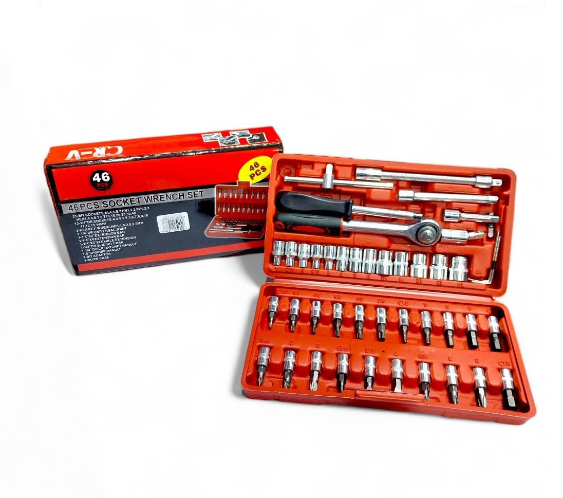 Set completo de herramientas con crique, tubos y puntas ideal para trabajos de mecánica, mantenimiento y uso doméstico. Incluye una amplia variedad de medidas y accesorios para cubrir múltiples tipos de tornillos y tuercas.