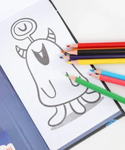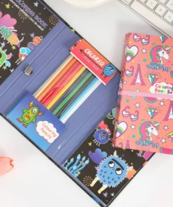 Un práctico y divertido set de arte infantil que incluye libro para colorear y lápices de colores, todo en un estuche plegable con cierre elástico.