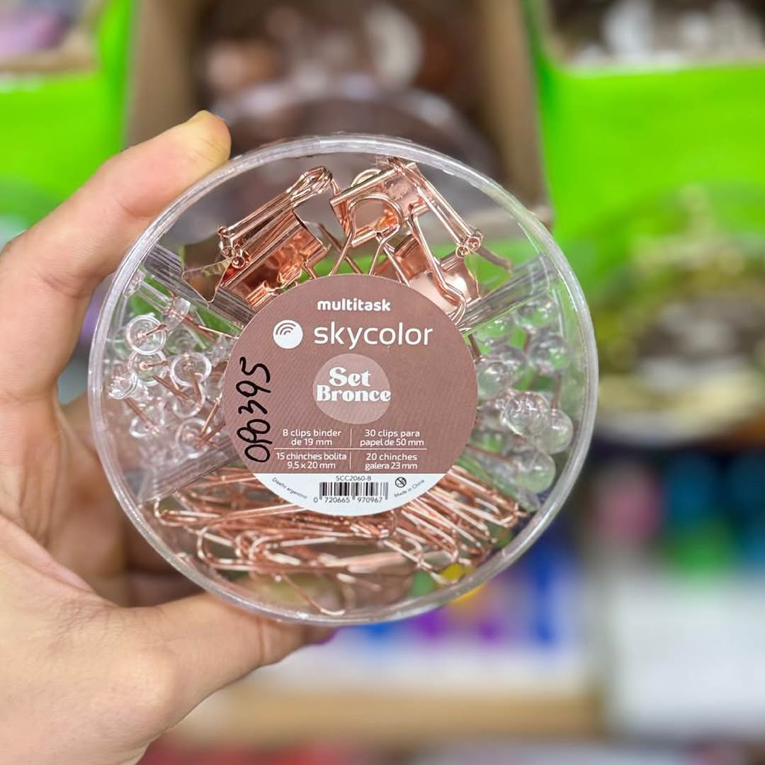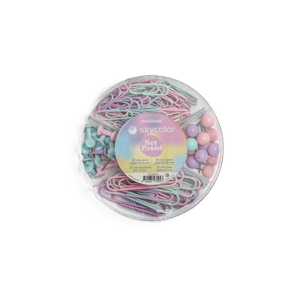 El set circular combina broches y chinches en un práctico paquete con diseño decorativo. Este set es ideal para organizar documentos, sujetar notas o decorar tableros en oficinas, hogares y escuelas. Con colores variados y materiales duraderos, aporta estilo y funcionalidad a tus tareas diarias. Perfecto para quienes buscan organización con un toque moderno.