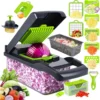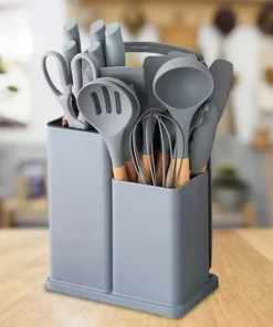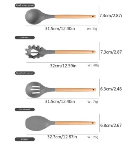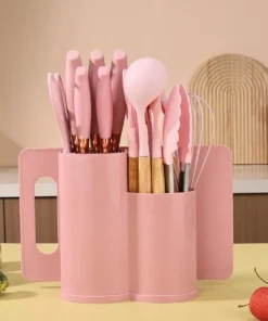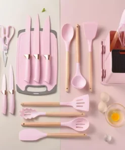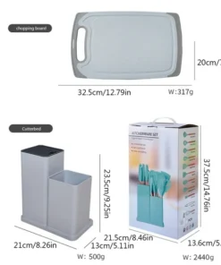 INCLUYE: tabla de picar, cuchillos varios tamaños, tijera, utensillos de silicona soft y mango de madera, contenedor/escurridor