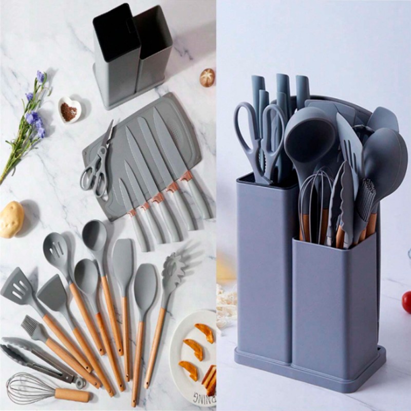 INCLUYE: tabla de picar, cuchillos varios tamaños, tijera, utensillos de silicona soft y mango de madera, contenedor/escurridor
