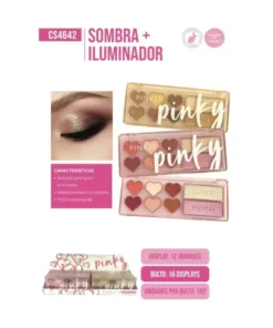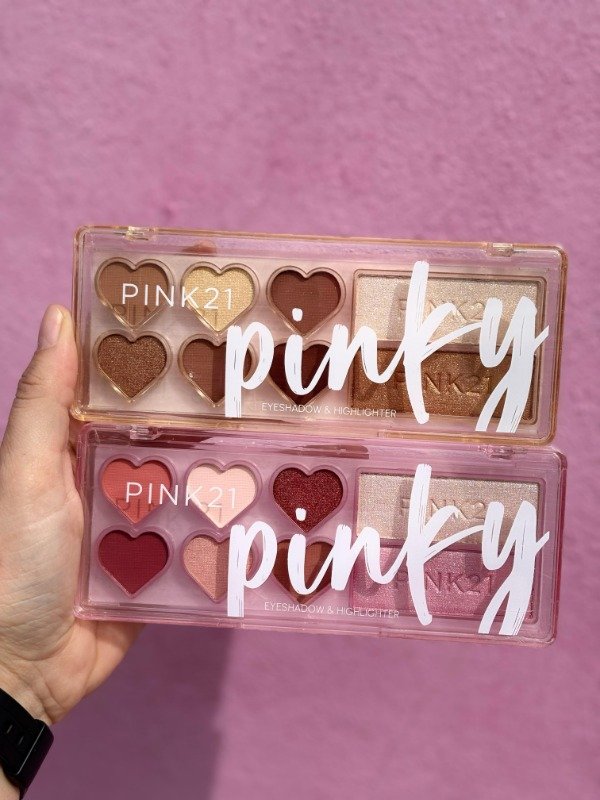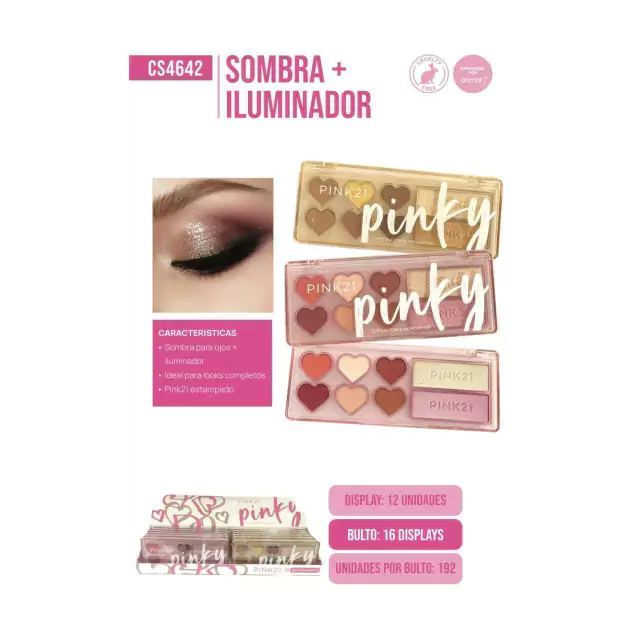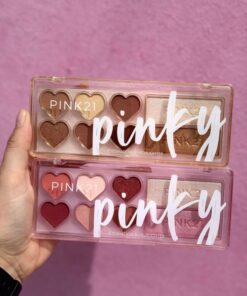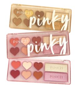 La Paleta Pinky de Pink 21 combina sombras de ojos y un iluminador en un solo estuche, ideal para crear looks completos de dia o de noche. Su diseño divertido con corazones estampados y su gama de colores versatil la convierten en un infaltable para cualquier amante del maquillaje.