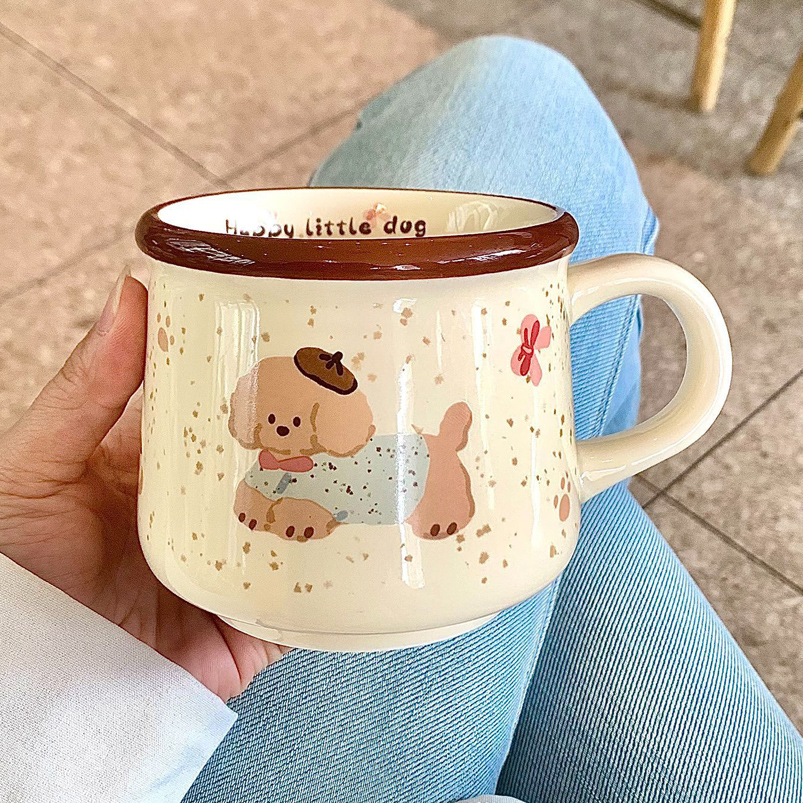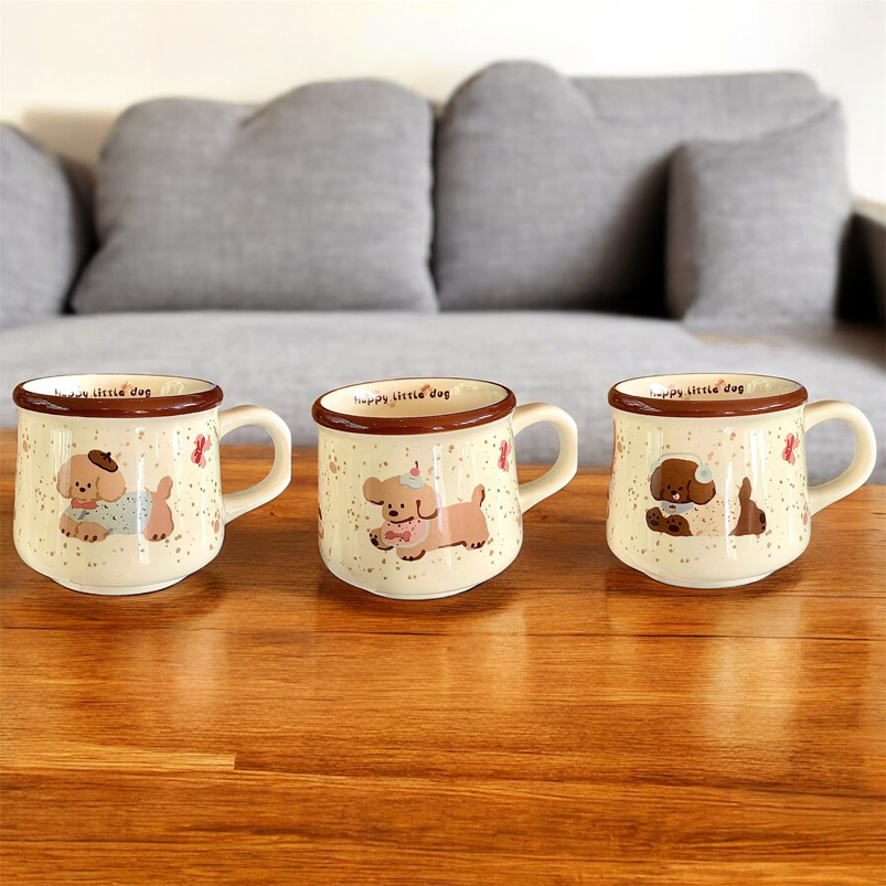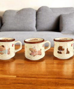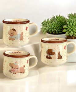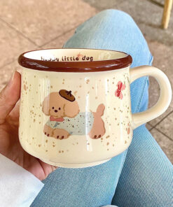 Taza cerámica esmaltada con estampas de perritos tiernos, hermoso con borde marrón que le da un look cálido y divertido. Ideal para café, té o chocolate; práctica para el día a día y perfecta como regalo para amantes de los animales.