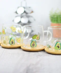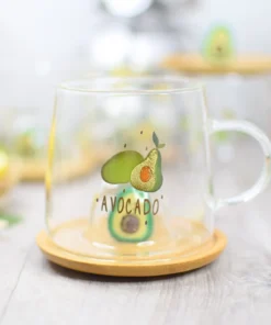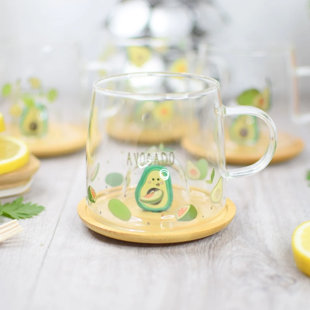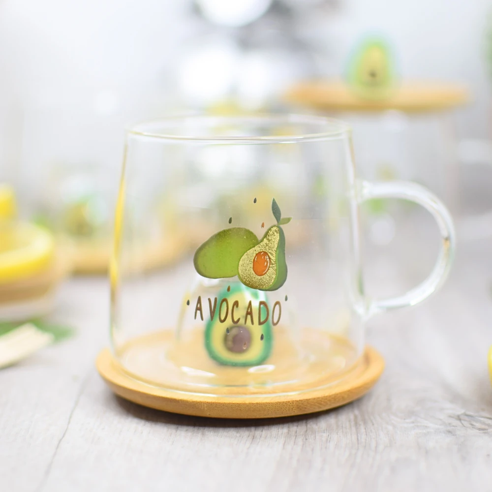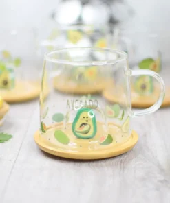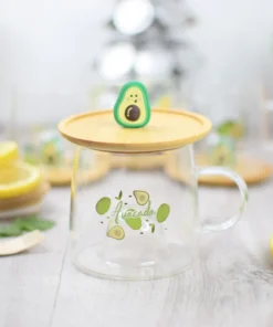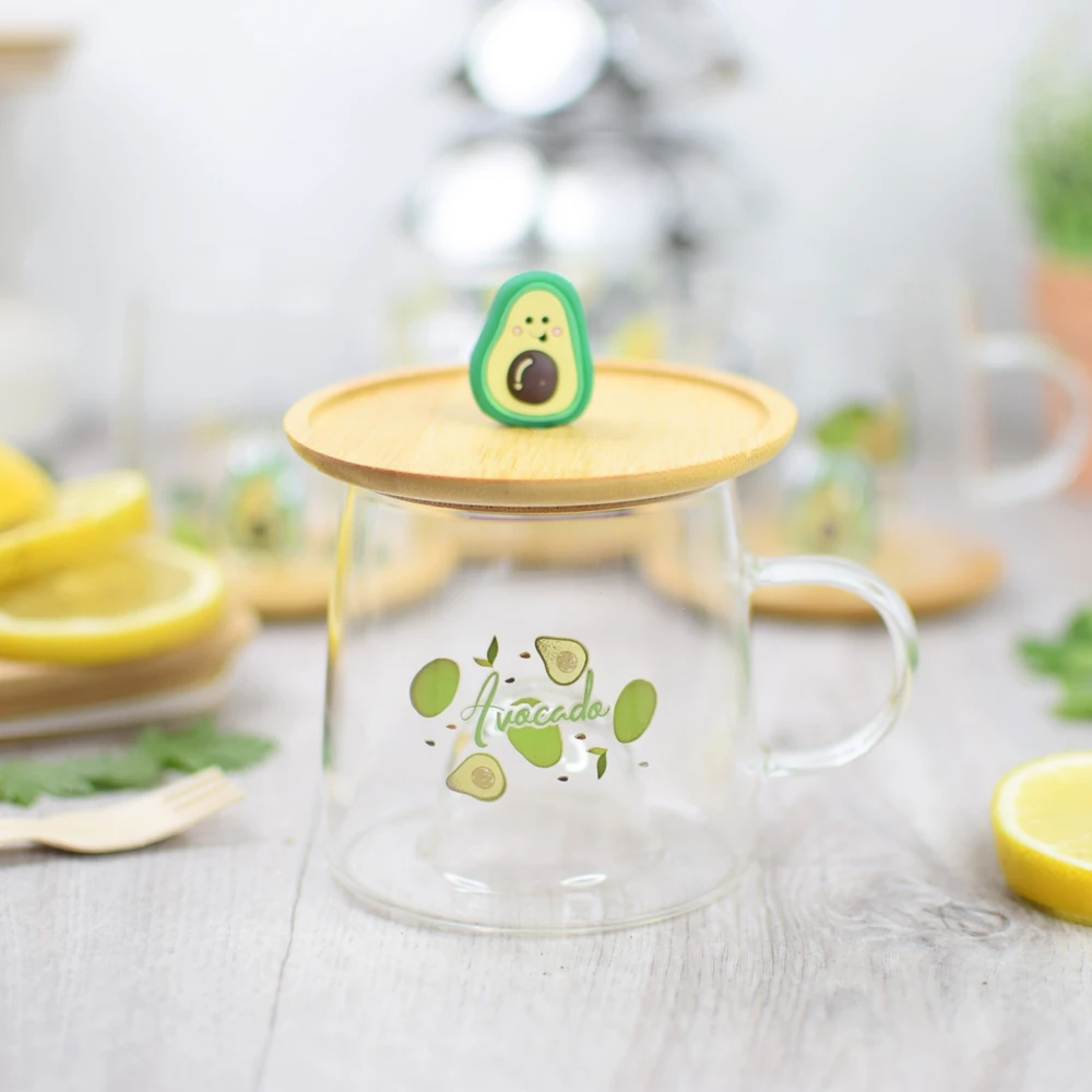 TAZA DE VIDRIO CON TAPA DE BAMBÚ Y PALTA DE SILICONA EN LA TAPA.