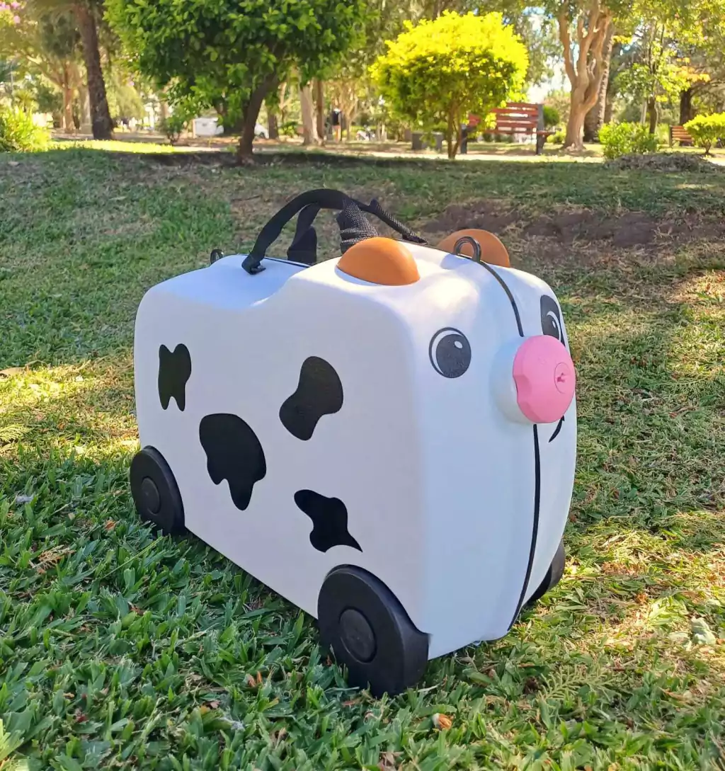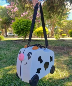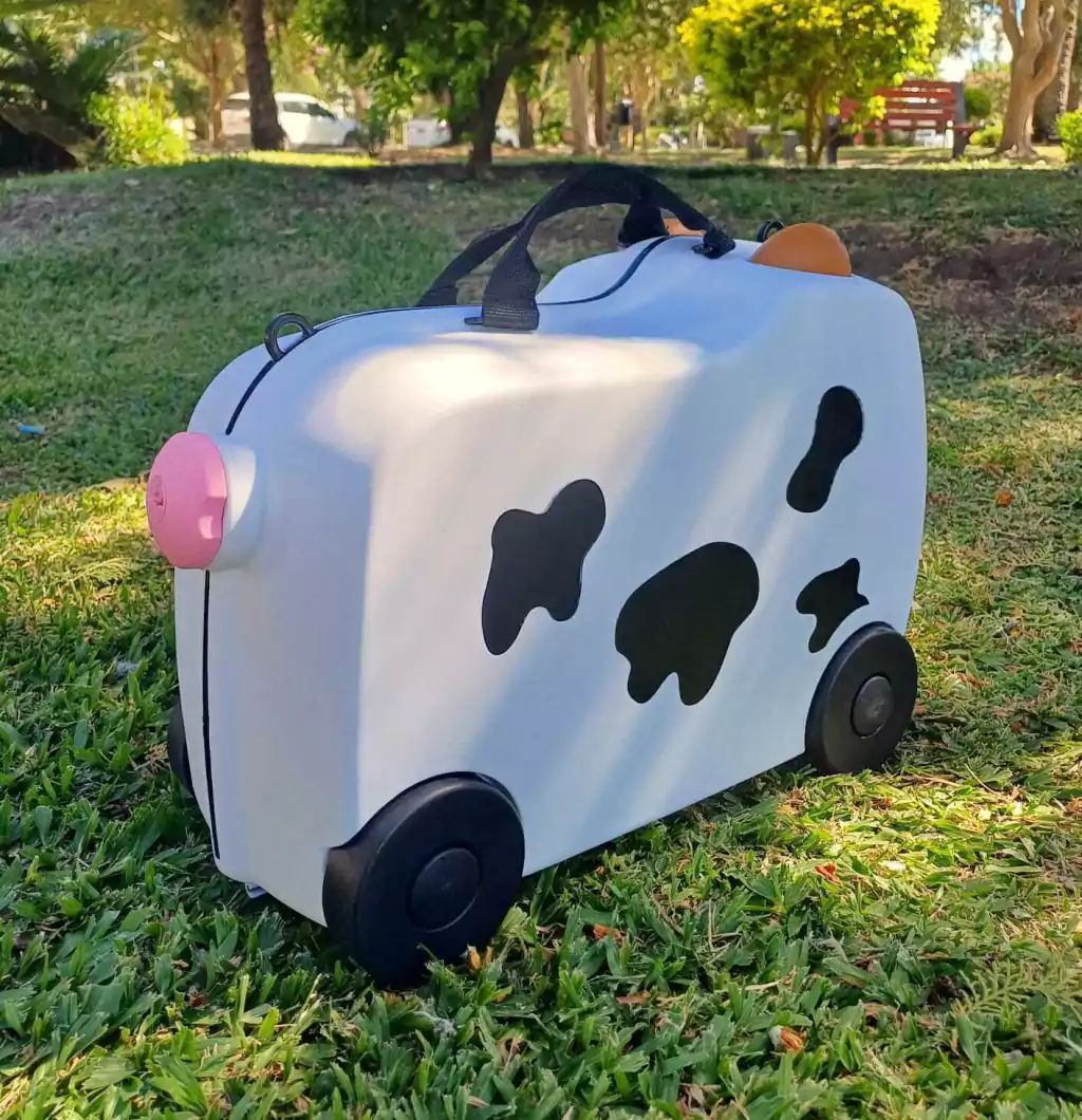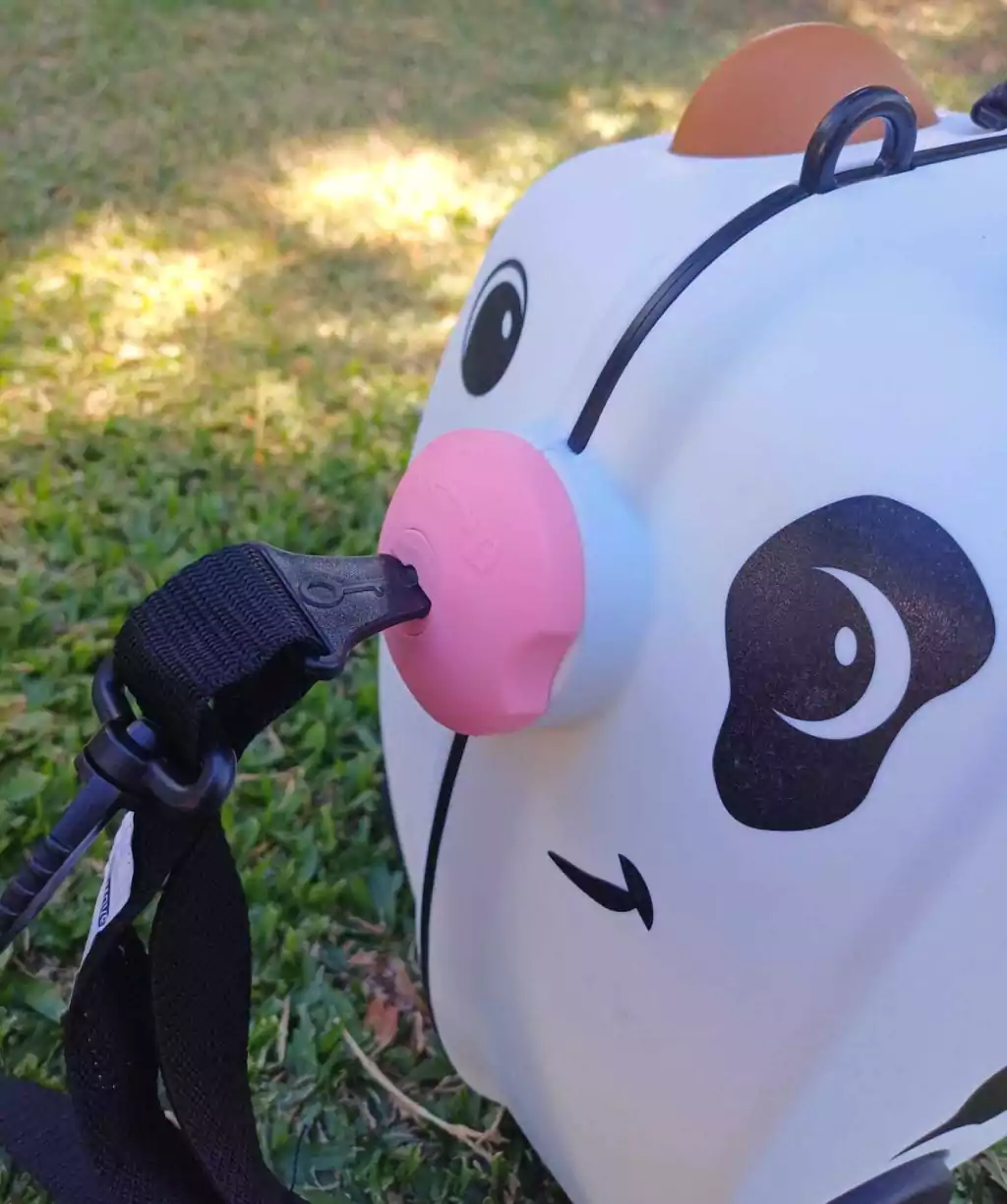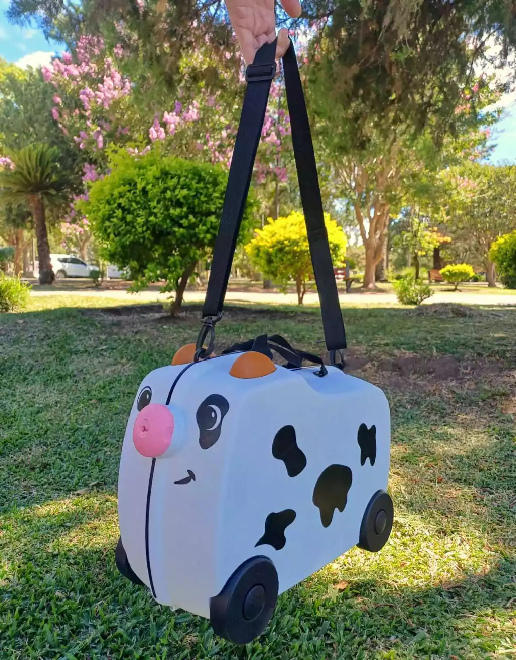 Valija infantil con rueditas. Tiene Rueditas para usarla como pata-pata, También manijas para llevarla y tiras regulables para colgarla al hombro. Tiene cierre a la vuelta para llenarla de juguetes o ropa, y broche de agarre. El Hocico y Colita son cierres con llave para mayor seguridad.