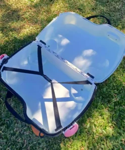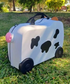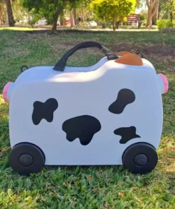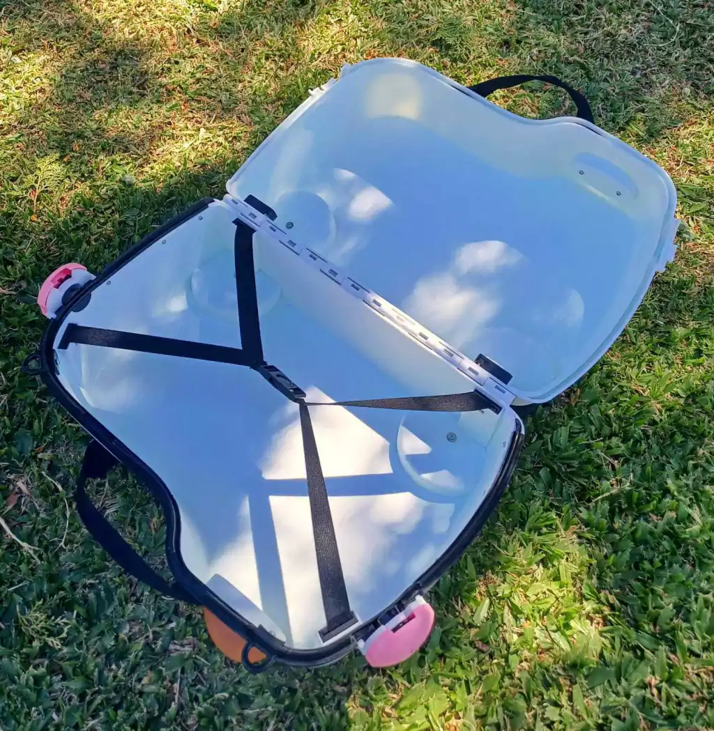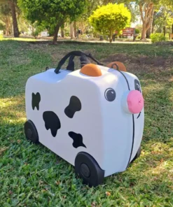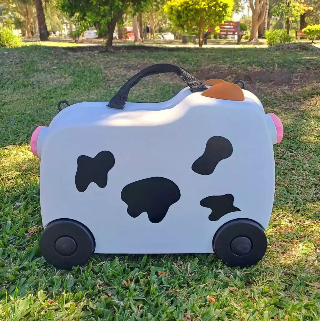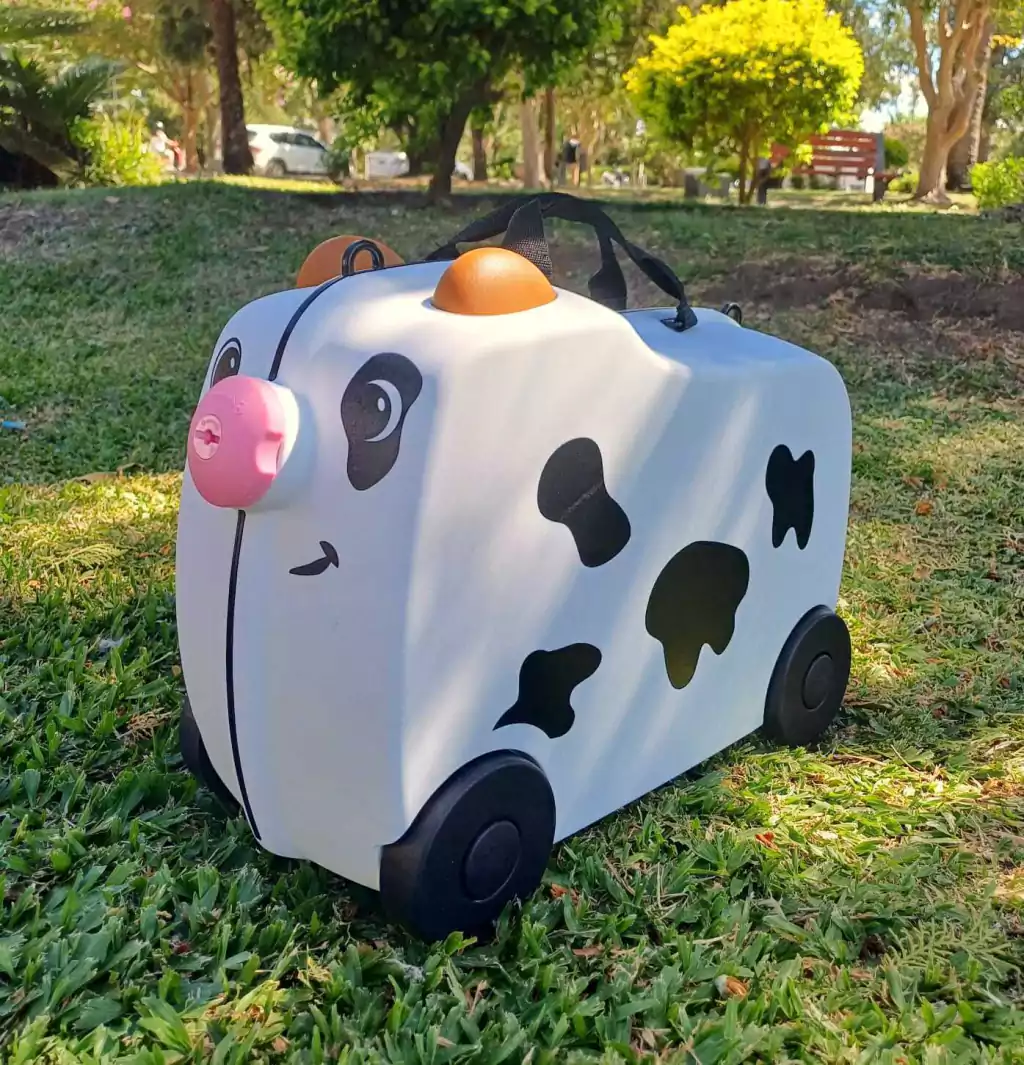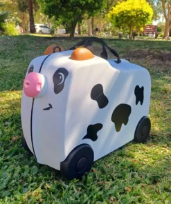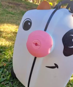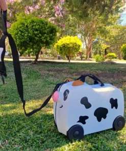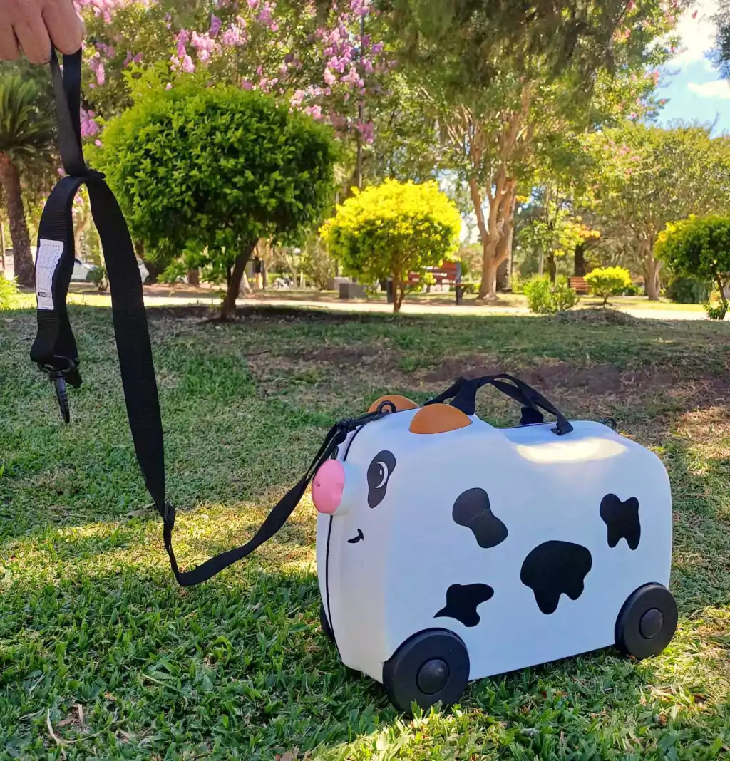 Valija infantil con rueditas. Tiene Rueditas para usarla como pata-pata, También manijas para llevarla y tiras regulables para colgarla al hombro. Tiene cierre a la vuelta para llenarla de juguetes o ropa, y broche de agarre. El Hocico y Colita son cierres con llave para mayor seguridad.