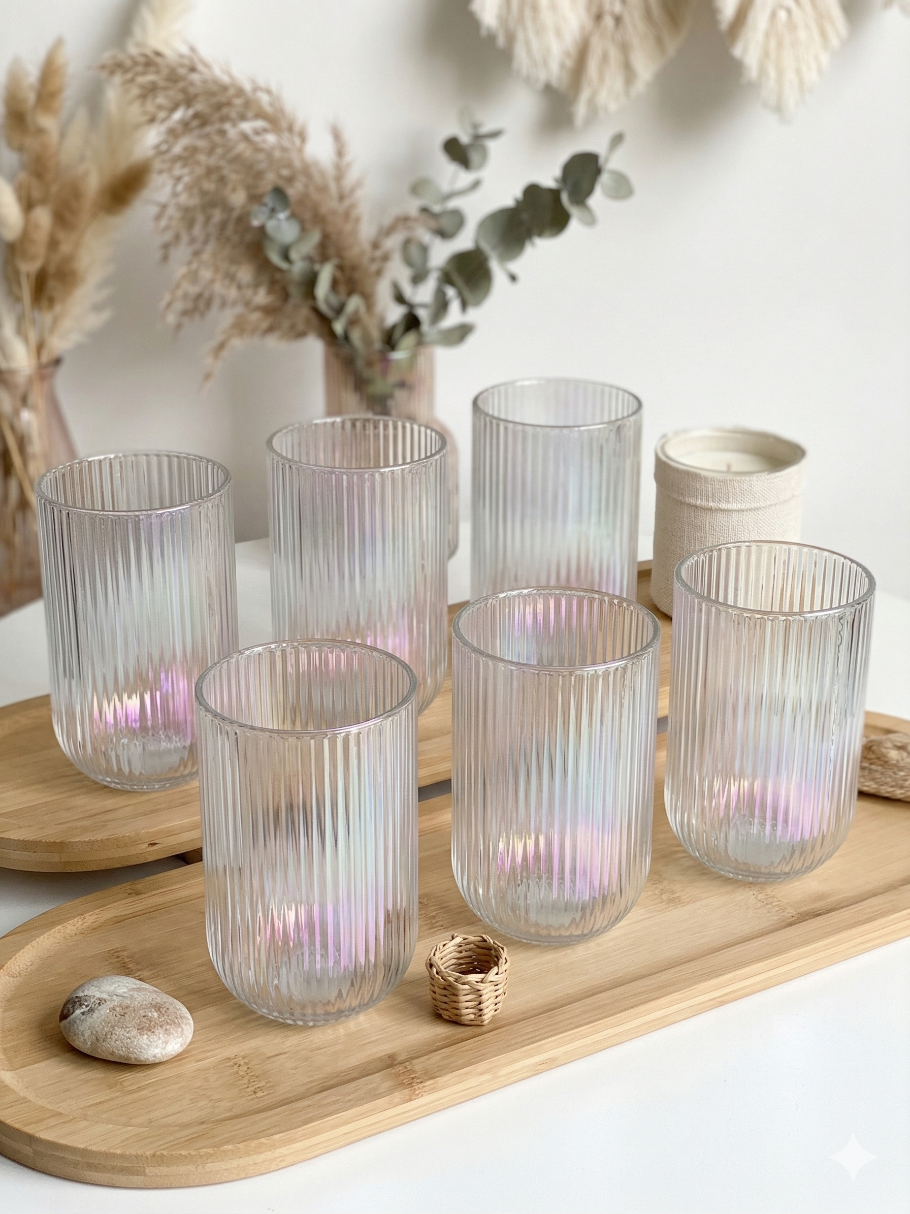Elegante set de 6 vasos de cristal con un llamativo acabado iridiscente y un sofisticado relieve estriado que le aporta textura.