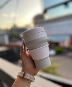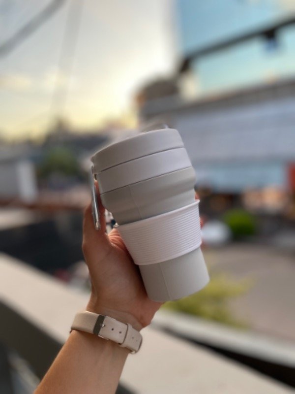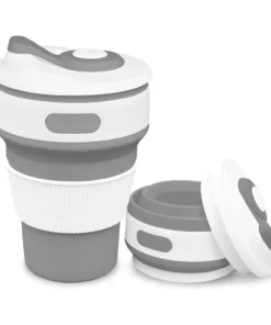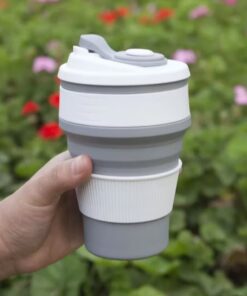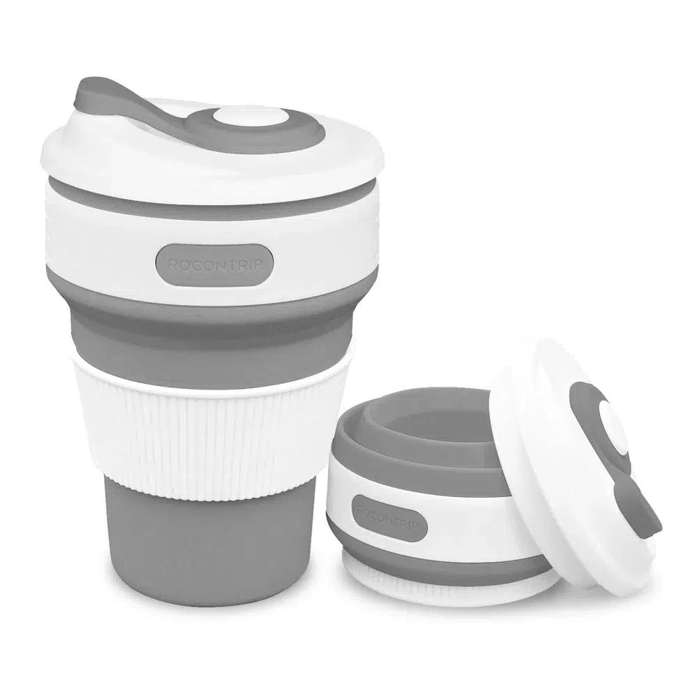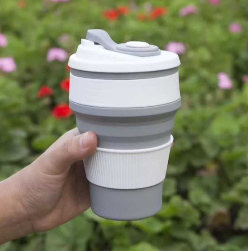 Vaso térmico plegable con tapa de cierre hermético, pico vertedor y agarradera y gancho.